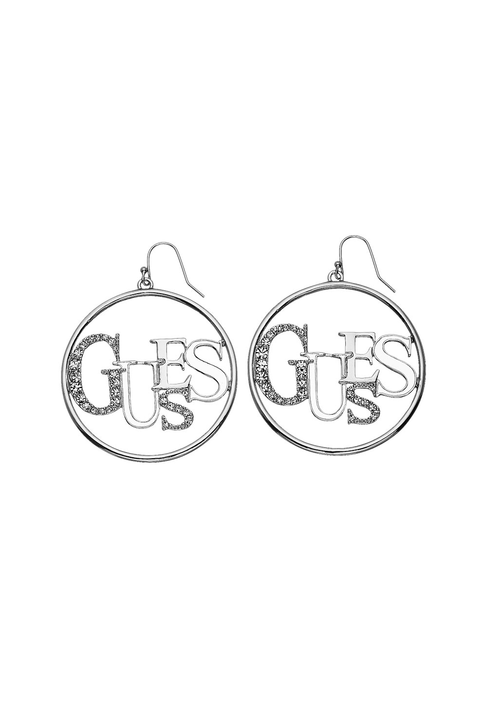 Γυναικεία σκουλαρίκια GUESS FAUX UBE10902 ασημένιου χρώματος με λογότυπο και διαφανείς πέτρες ζιργκόν.