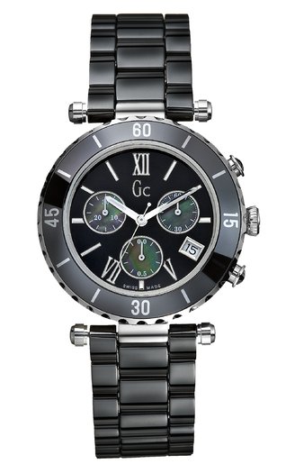Γυναικείο ρολόι GC 43001M2 διαμέτρου 38mm, με μηχανισμό Quartz χρονογράφου ακριβείας, μαύρο καντράν, κεραμική κάσα και μπρασελέ μαύρου χρώματος.