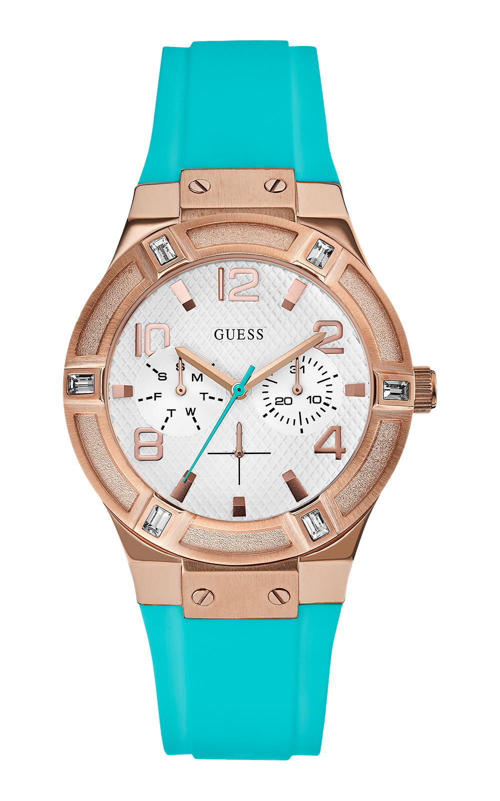 Γυναικείο ρολόι διαμέτρου 39mm με μηχανισμό QUARTZ Multi-Function ακριβείας. Έχει λευκό καντράν με ροζ επίχρυσους δείκτες και λεπτομέρειες και ένδειξη ημερομηνίας. Η κάσα του είναι από ανοξείδωτο ατσάλι επιχρυσωμένη με ροζ χρυσό, με κρύσταλλο από ορυκτό κρύσταλλο ειδικής σκλήρυνσης. Έχει τιρκουάζ λουράκι από καουτσούκ με κούμπωμα τοκάς. Είναι αδιάβροχο (5 ΑΤΜ).