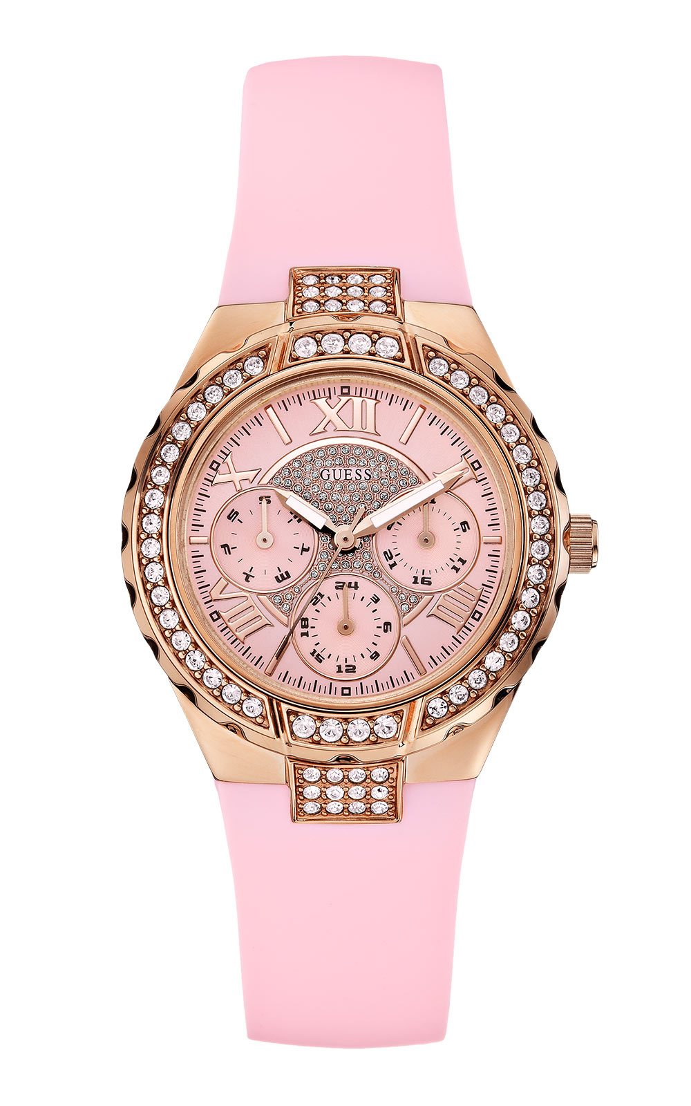Γυναικείο ρολόι GUESS VIVA W0300L3 διαμέτρου 37mm, με μηχανισμό QUARTZ Multi-Function ακριβείας, ροζ καντράν, κάσα επιχρυσωμένη από ανοξείδωτο ατσάλι και ροζ λουράκι από καουτσούκ.