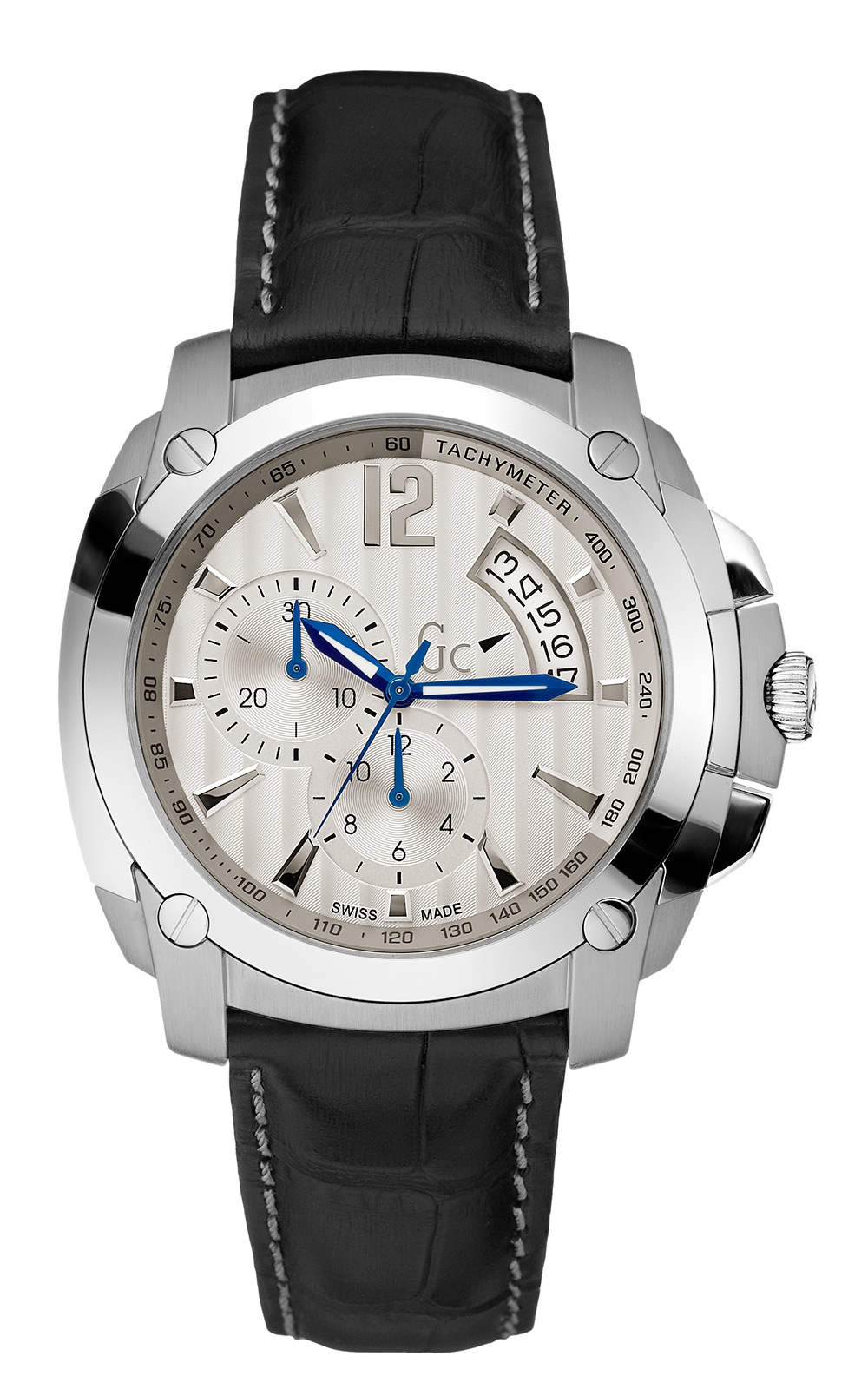 Αντρικό ρολόι GC X78003G1S διαμέτρου 41mm, με μηχανισμό Quartz χρονογράφου ακριβείας, ασημένιο καντράν, κάσα από ανοξείδωτο ατσάλι και μαύρο κροκό δερμάτινο λουράκι.