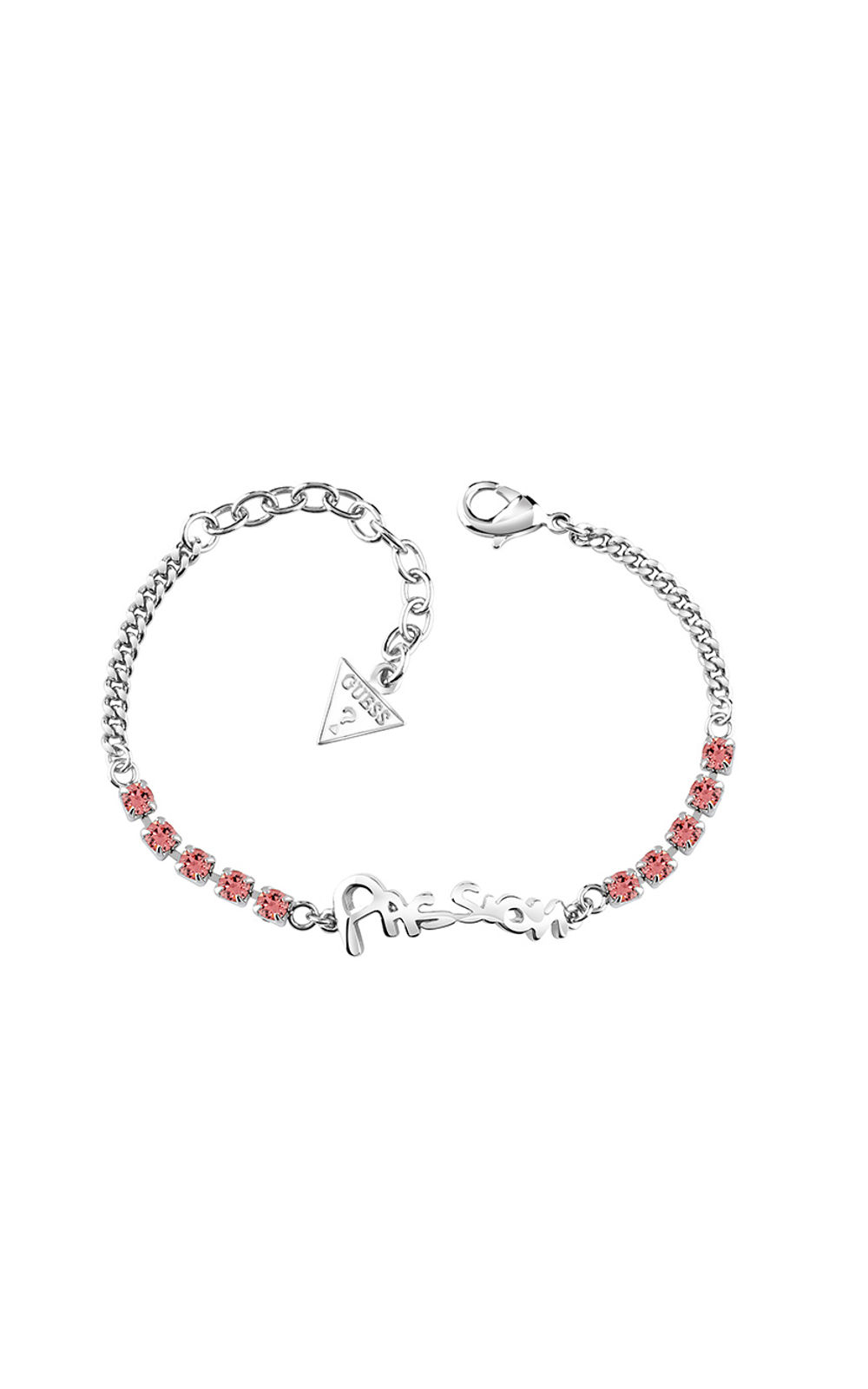 Γυναικείο βραχιόλι GUESS FAUX ασημένιου χρώματος. Είναι διακοσμημένο με ροζ πέτρες ζιργκόν.