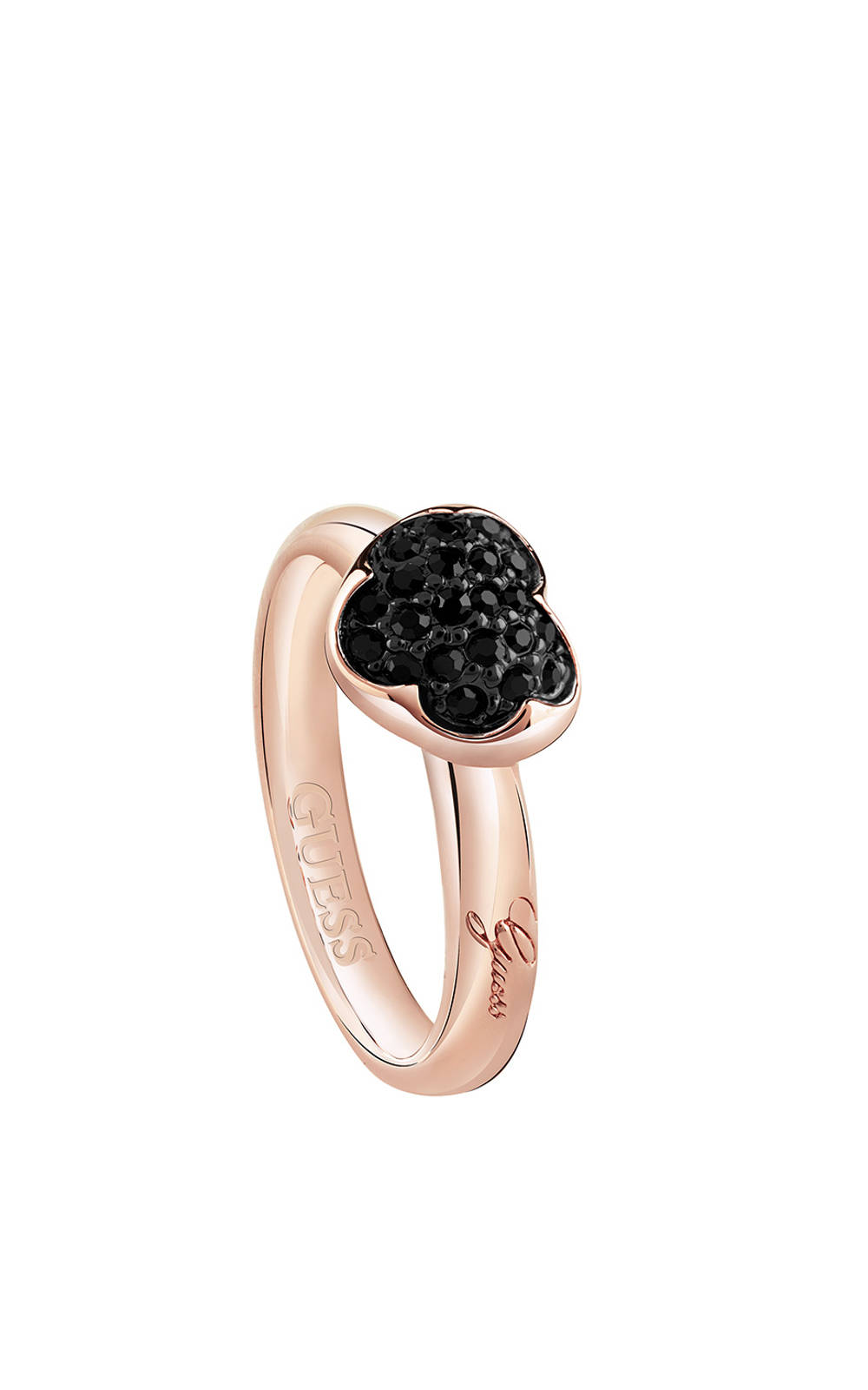 Γυναικείο δαχτυλίδι GUESS FAUX UBR72503-54 ροζ χρυσού χρώματος με καρδιά και μαύρες πέτρες ζιργκόν.