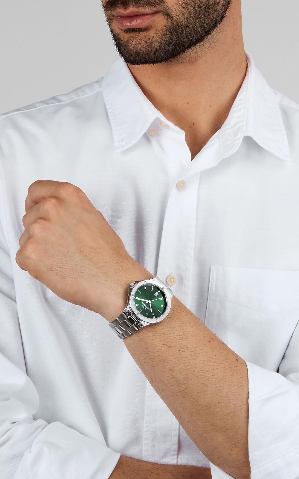 Ανδρικό ρολόι διαμέτρου 42mm με μηχανισμό QUARTZ ακριβείας. Έχει πράσινο καντράν με ασημένιους δείκτες και λεπτομέρειες. Η κάσα του είναι μεταλλική και έχει κρύσταλλο από ορυκτό κρύσταλλο ειδικής σκλήρυνσης. Έχει μπρασελέ από ανοξείδωτο ατσάλι και κούμπωμα ασφαλείας. Δεν είναι αδιάβροχο.