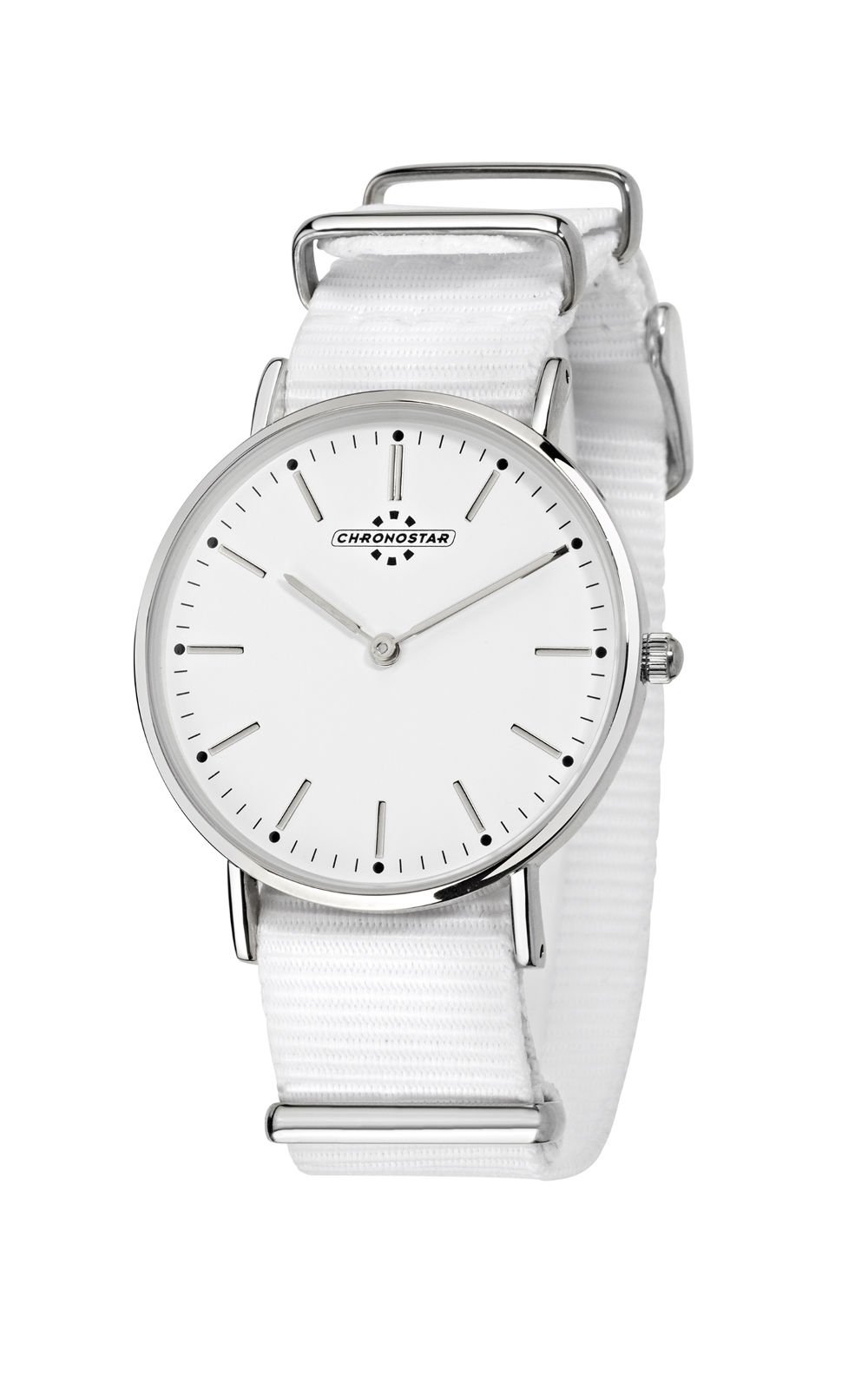 Γυναικείο ρολόι CHRONOSTAR PREPPY R3751252505 διαμέτρου 36mm, με μηχανισμό QUARTZ ακριβείας, λευκό καντράν, μεταλλική κάσα και λευκό υφασμάτινο λουράκι.