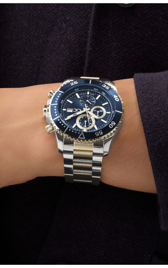 Ανδρικό ρολόι διαμέτρου 44mm, με μηχανισμό Quartz χρονογράφου ακριβείας. Έχει μπλε καντράν με χρυσούς δείκτες και λεπτομέρειες και ένδειξη ημερομηνίας. Η κάσα του είναι ασημένια από ανοξείδωτο ατσάλι με χρυσές λεπτομέρειες και κρύσταλλο από ορυκτό κρύσταλλο. Έχει ασημένιο και χρυσό μπρασελέ από ανοξείδωτο ατσάλι και κούμπωμα ασφαλείας. Είναι αδιάβροχο (10 ΑΤΜ).