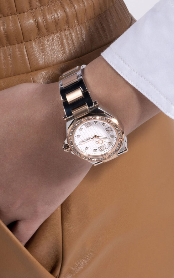 Γυναικείο ρολόι διαμέτρου 34mm με μηχανισμό Quartz ακριβείας. Έχει λευκό καντράν με ροζ επίχρυσους δείκτες και λεπτομέρειες. Η κάσα του είναι από ανοξείδωτο ατσάλι με κρύσταλλο ορυκτό με επικάλυψη από ζαφείρι. Έχει μπρασελέ από ανοξείδωτο ατσάλι και κούμπωμα ασφαλείας. Είναι αδιάβροχο (10 ΑΤΜ).