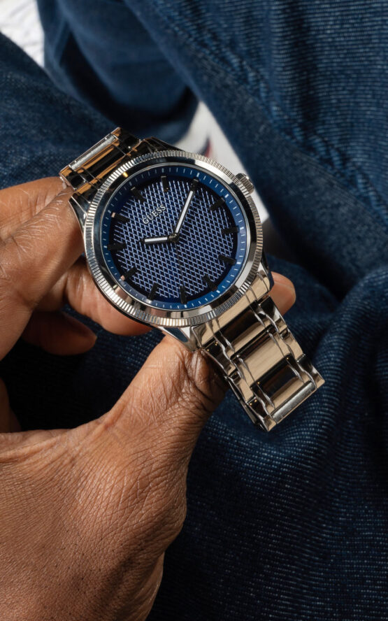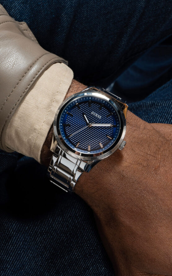 Ανδρικό ρολόι GUESS DEX GW0626G1 διαμέτρου 44mm, με μηχανισμό Quartz ακριβείας, μπλε καντράν, κάσα και μπρασελέ από ανοξείδωτο ατσάλι.