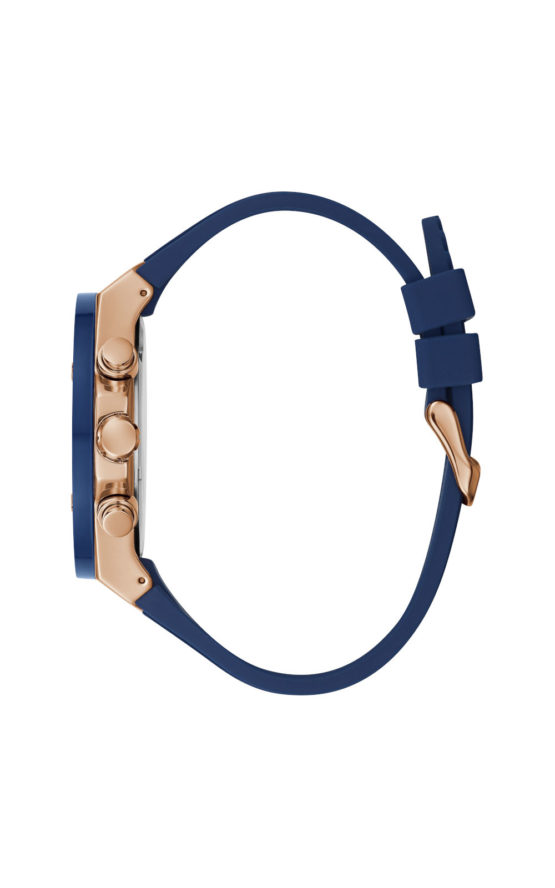 Ανδρικό ρολόι διαμέτρου 46mm με μηχανισμό QUARTZ χρονογράφου ακριβείας. Έχει μπλε καντράν, ροζ επίχρυσους δείκτες και λεπτομέρειες. Η κάσα του είναι ροζ επίχρυση από ανοξείδωτο ατσάλι, με μπλε λεπτομέρειες και κρύσταλλο από ορυκτό κρύσταλλο ειδικής σκλήρυνσης. Έχει μπλε καουτσούκ λουράκι με κούμπωμα τοκάς. Είναι αδιάβροχο (5 ΑΤΜ).