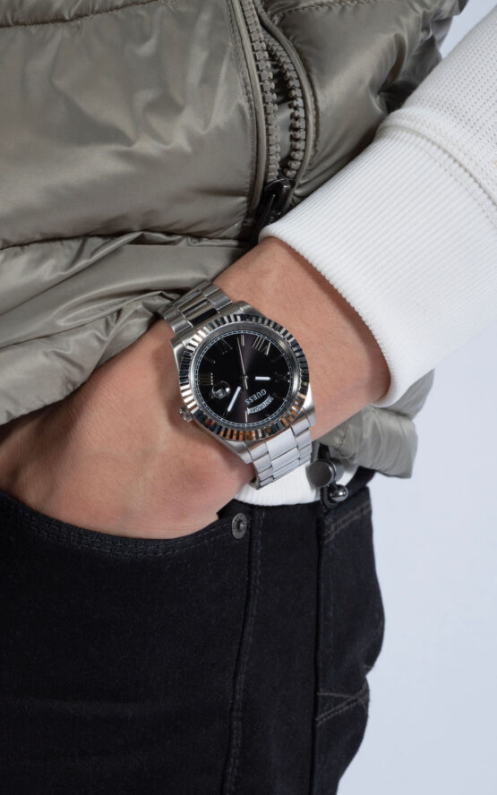 Ανδρικό ρολόι διαμέτρου 42mm με μηχανισμό QUARTZ ακριβείας. Έχει μαύρο καντράν με ασημένιους δείκτες και λεπτομέρειες και ένδειξη ημερομηνίας. Η κάσα του είναι από ανοξείδωτο ατσάλι, με κρύσταλλο από ορυκτό κρύσταλλο ειδικής σκλήρυνσης. Έχει μπρασελέ από ανοξείδωτο ατσάλι και κούμπωμα ασφαλείας. Είναι αδιάβροχο (5 ΑΤΜ).