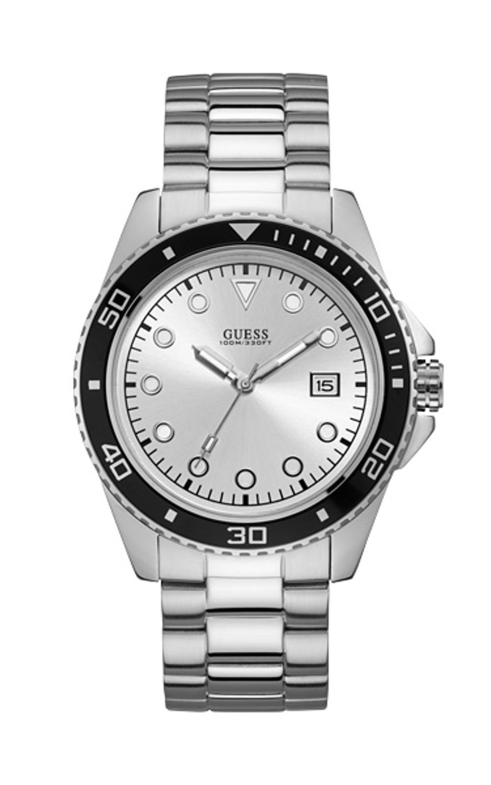 Ανδρικό ρολόι GUESS CREW W1002G3 διαμέτρου 44mm, με μηχανισμό QUARTZ ακριβείας, ασημένιο καντράν, κάσα και μπρασελέ από ανοξείδωτο ατσάλι.