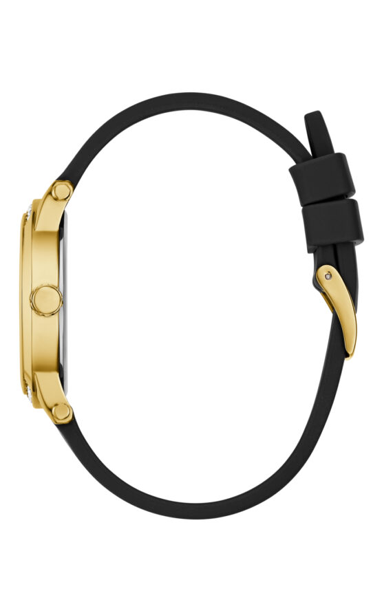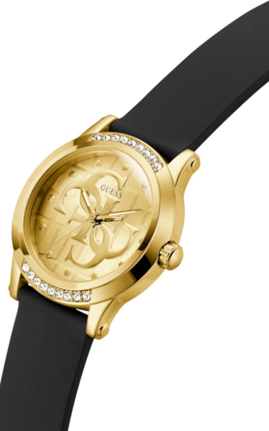 Γυναικείο ρολόι διαμέτρου 36mm με μηχανισμό QUARTZ ακριβείας. Έχει χρυσό καντράν και χρυσούς δείκτες. Η κάσα του είναι από ανακυκλωμένο ατσάλι χρυσού χρώματος με κρύσταλλο από ορυκτό κρύσταλλο ειδικής σκλήρυνσης και πέτρες. Έχει μαύρο λουράκι από καουτσούκ και κούμπωμα τοκάς. Δεν είναι αδιάβροχο.