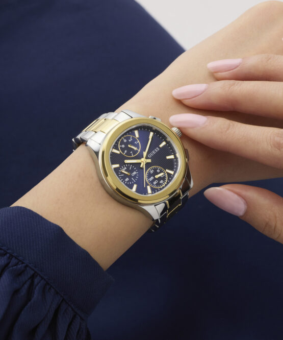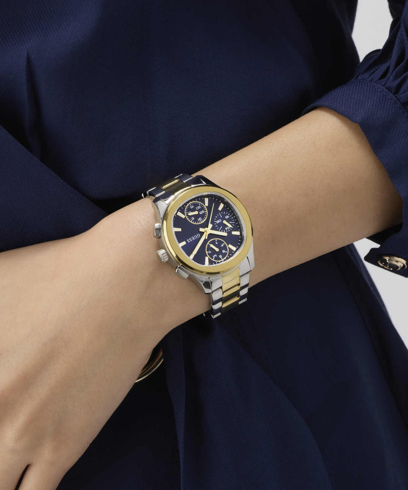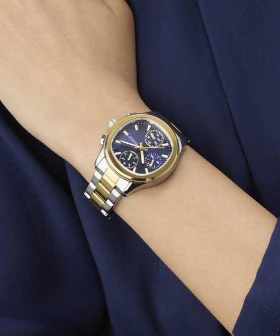 Γυναικείο ρολόι διαμέτρου 36mm με μηχανισμό QUARTZ multifuction ακριβείας. Έχει μπλε καντράν με χρυσούς δείκτες και λεπτομέρειες. Η κάσα του είναι χρυσή-ασημένια από ανακυκλωμένο ατσάλι και έχει κρύσταλλο από ορυκτό κρύσταλλο ειδικής σκλήρυνσης. Έχει μπρασελέ από ανακυκλωμένο ατσάλι με κούμπωμα ασφαλείας. Είναι αδιάβροχο (5ΑΤΜ).