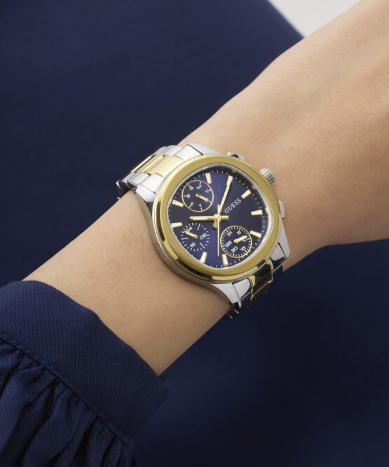 Γυναικείο ρολόι GUESS BIRDIE GW1031L3 διαμέτρου 36mm, με μηχανισμό QUARTZ multifuction ακριβείας, μπλε καντράν,κάσα και μπρασελέ από ανακυκλωμένο ατσάλι και κούμπωμα ασφαλείας.
