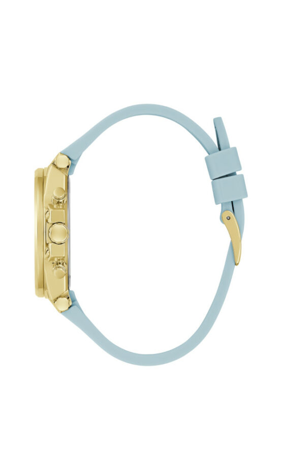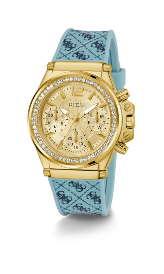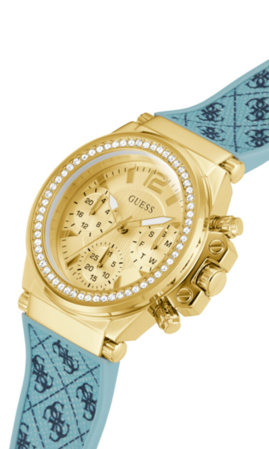Γυναικείο ρολόι GUESS CHARISMA GW0699L1 διαμέτρου 38mm, με μηχανισμό Quartz Multi-Function, χρυσό καντράν, κάσα λουράκι από καουτσούκ και κουμπώμα τόκας .