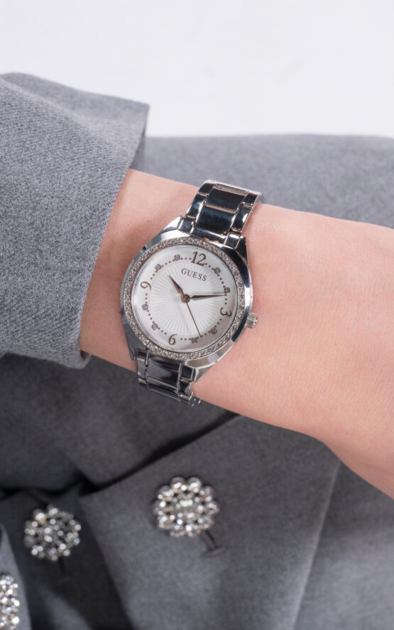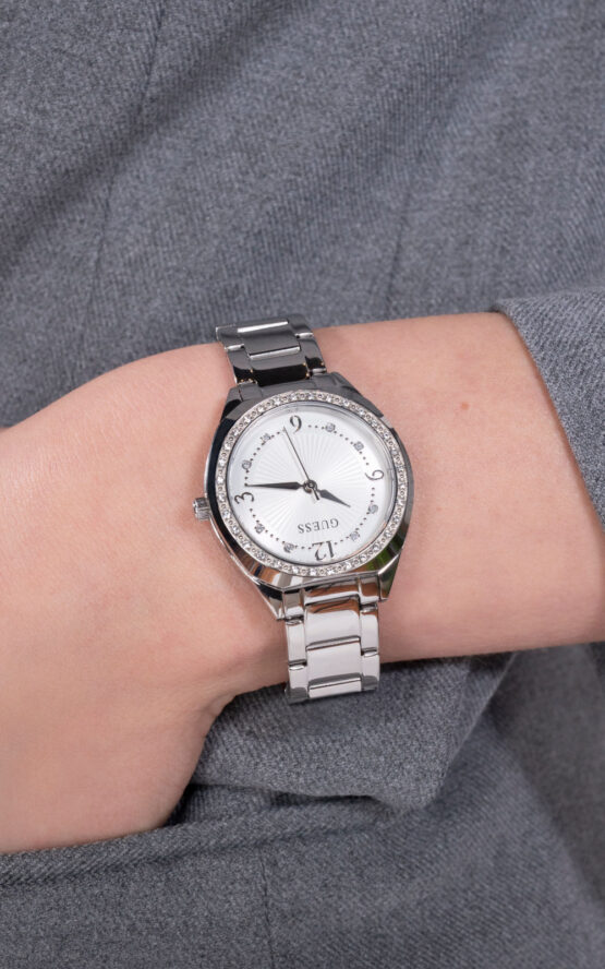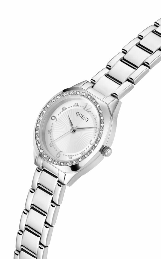 Γυναικείο ρολόι GUESS CHARLOTTE GW0767L1 διαμέτρου 30mm, με μηχανισμό QUARTZ ακριβείας, ασημένιο καντράν και μπρασελέ από ανακυκλωμένο ατσάλι.