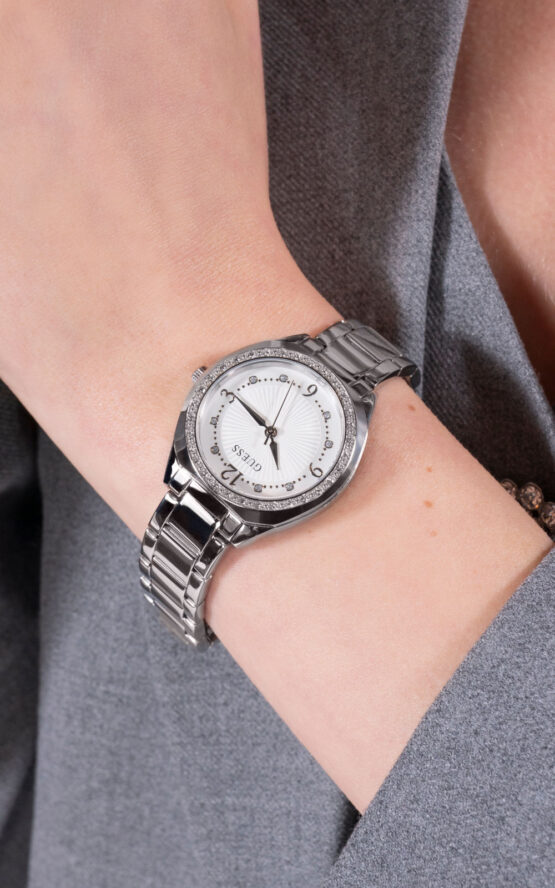 Γυναικείο ρολόι διαμέτρου 30mm με μηχανισμό QUARTZ ακριβείας. Έχει ασημένιο καντράν με διαφανείς πέτρες ζιργκόν και ασημί δείκτες. Η κάσα του είναι από ανακυκλωμένο ατσάλι με ασημένιες λεπτομέρειες.Έχει ασημένιο μπρασελέ και κούμπωμα ασφαλείας. Δεν είναι αδιάβροχο.