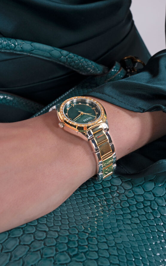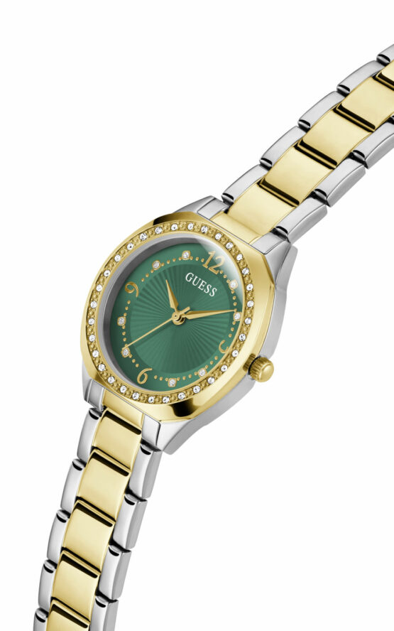 Γυναικείο ρολόι GUESS CHARLOTTE GW0767L4 διαμέτρου 30mm, με μηχανισμό QUARTZ ακριβείας, πράσινο καντράν και μπρασελέ από ανακυκλωμένο ατσάλι.