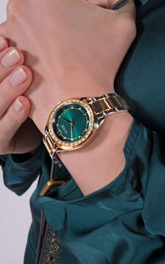 Γυναικείο ρολόι διαμέτρου 30mm με μηχανισμό QUARTZ ακριβείας. Έχει πράσινο καντράν με διαφανείς πέτρες ζιργκόν και χρυσούς δείκτες. Η κάσα του είναι από ανακυκλωμένο ατσάλι με χρυσές λεπτομέρειες.Έχει χρυσό-ασημί μπρασελέ και κούμπωμα ασφαλείας. Δεν είναι αδιάβροχο.