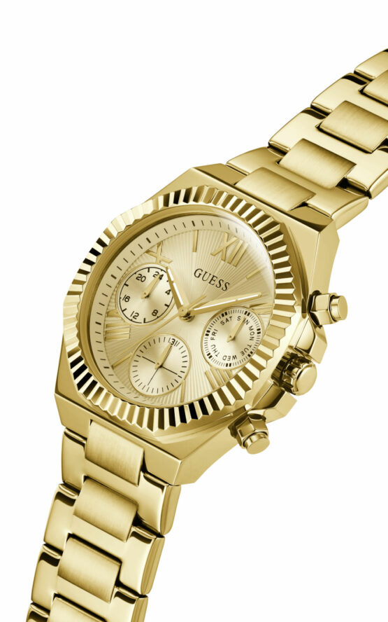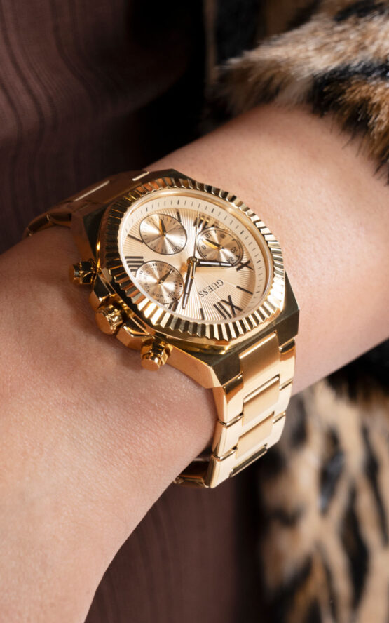 Γυναικείο ρολόι διαμέτρου 38mm με μηχανισμό Quartz multifuction ακριβείας. Έχει χρυσό καντράν με επίχρυσους δείκτες. Η κάσα του είναι από ανακυκλωμένο ατσάλι με χρυσές λεπτομέρειες.Έχει χρυσό μπρασελέ και κούμπωμα ασφαλείας. Είναι αδιάβροχο (5 ΑΤΜ).