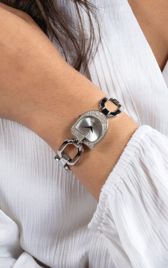 Γυναικείο ρολόι διαμέτρου 22mm με μηχανισμό QUARTZ ακριβείας. Έχει ασημένιο καντράν και ασημένιους δείκτες . Η κάσα του είναι από ανοξείδωτο ατσάλι διακοσμημένη με κρυστάλλα και κρύσταλλο από ορυκτό κρύσταλλο ειδικής σκλήρυνσης. Έχει μπρασελέ από ανοξείδωτο ατσάλι και κούμπωμα G-Link. Δεν είναι αδιάβροχο.