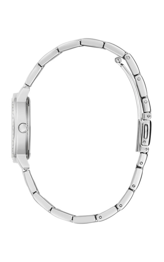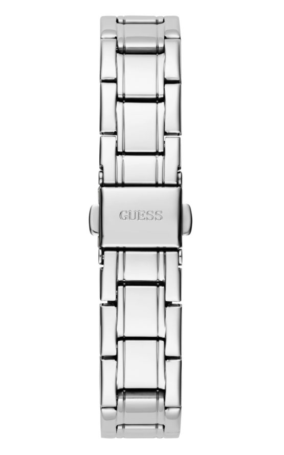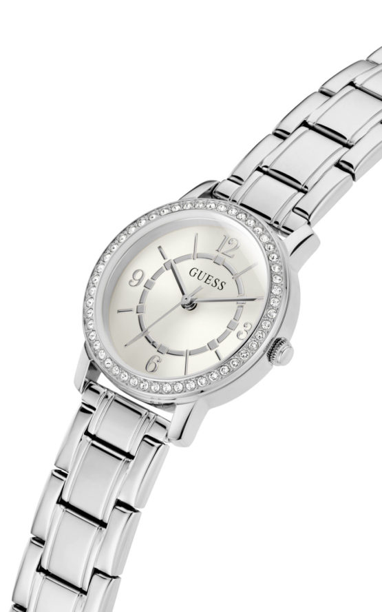 Γυναικείο ρολόι GUESS MELODY GW0468L1 διαμέτρου 28mm, με μηχανισμό Quartz Ακριβείας, υπόλευκο καντράν, ασημί κάσα και μπρασελέ από ανοξείδωτο ατσάλι.