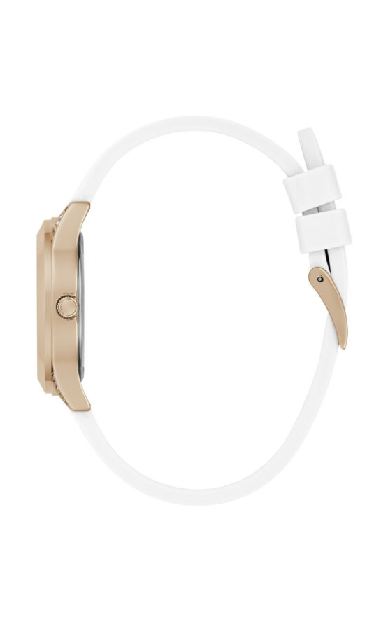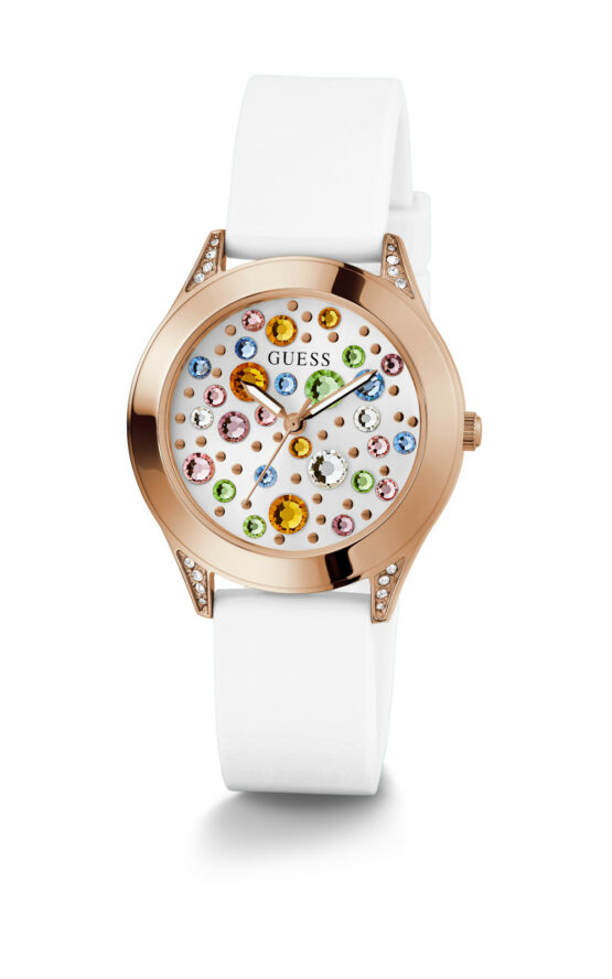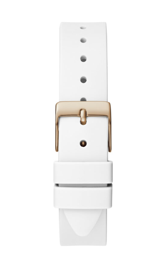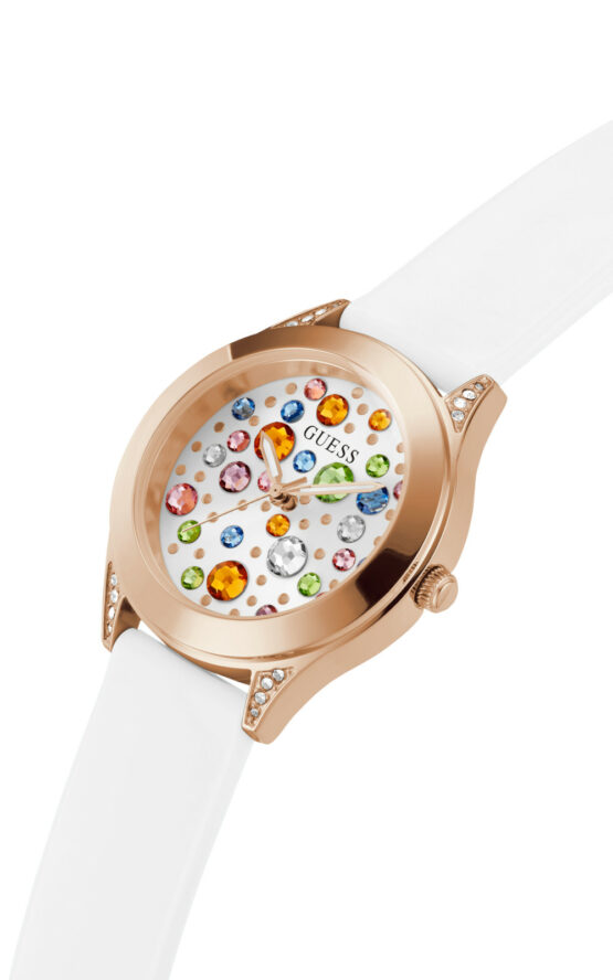 Γυναικείο ρολόι GUESS MINI WONDERLUST GW0678L4 διαμέτρου 34mm, με μηχανισμό Quartz ακριβείας, ασημένιο καντράν, ροζ επίχρυση κάσα και λευκό καουτσούκ λουράκι .