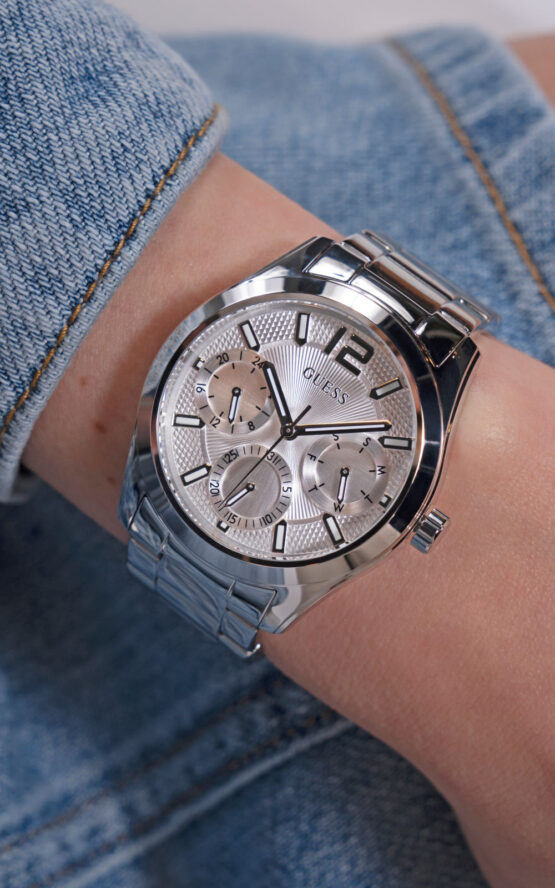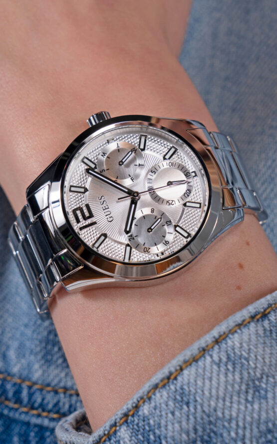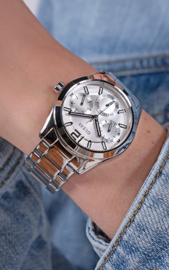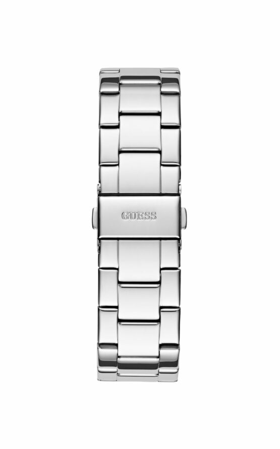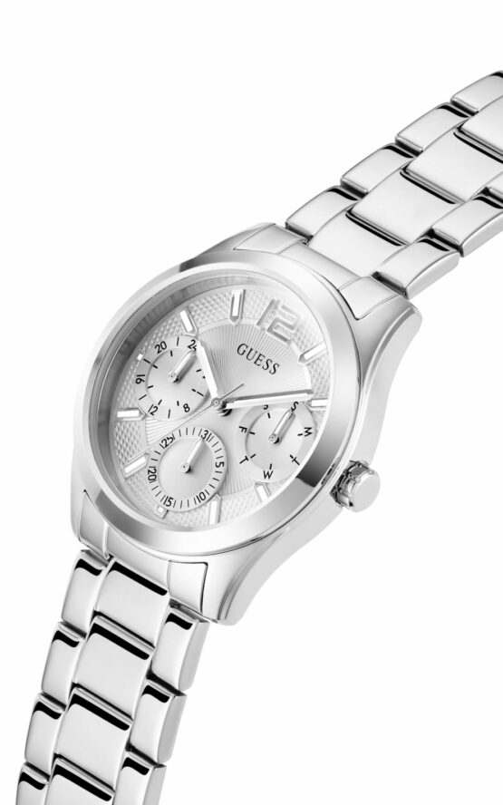 Γυναικείο ρολόι GUESS ZOE GW0760L1 διαμέτρου 38mm, με μηχανισμό Quartz multifuction ακριβείας, ασημένιο καντράν και μπρασελέ από ανακυκλωμένο ατσάλι.