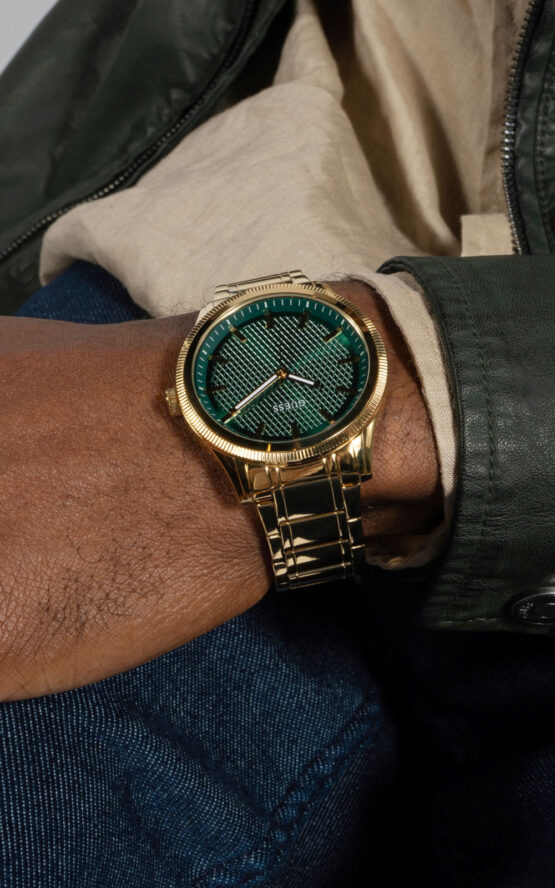 Ανδρικό ρολόι GUESS DEX GW0626G2 διαμέτρου 44mm, με μηχανισμό Quartz ακριβείας, πράσινο καντράν, επίχρυσο κάσα και μπρασελέ από ανοξείδωτο ατσάλι.