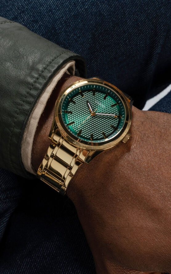 Ανδρικό ρολόι διαμέτρου 44mm με μηχανισμό QUARTZ ακριβείας. Έχει πράσινο καντράν με επίχρυσους δείκτες και λεπτομέρειες. Η κάσα του είναι επίχρυσο από ανοξείδωτο ατσάλι, με κρύσταλλο από ορυκτό κρύσταλλο ειδικής σκλήρυνσης. Έχει επίχρυσο μπρασελέ από ανοξείδωτο ατσάλι και κούμπωμα ασφαλείας. Δεν είναι αδιάβροχο.