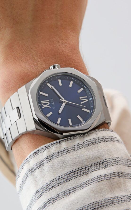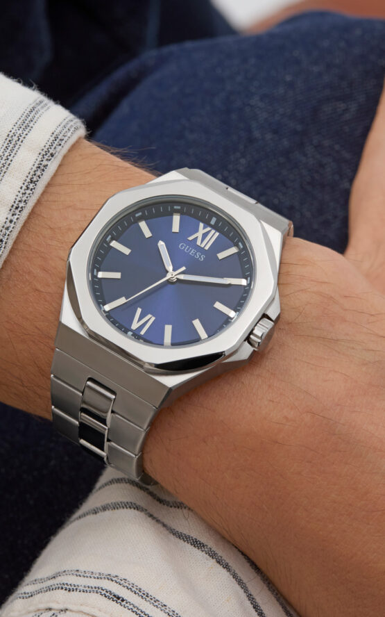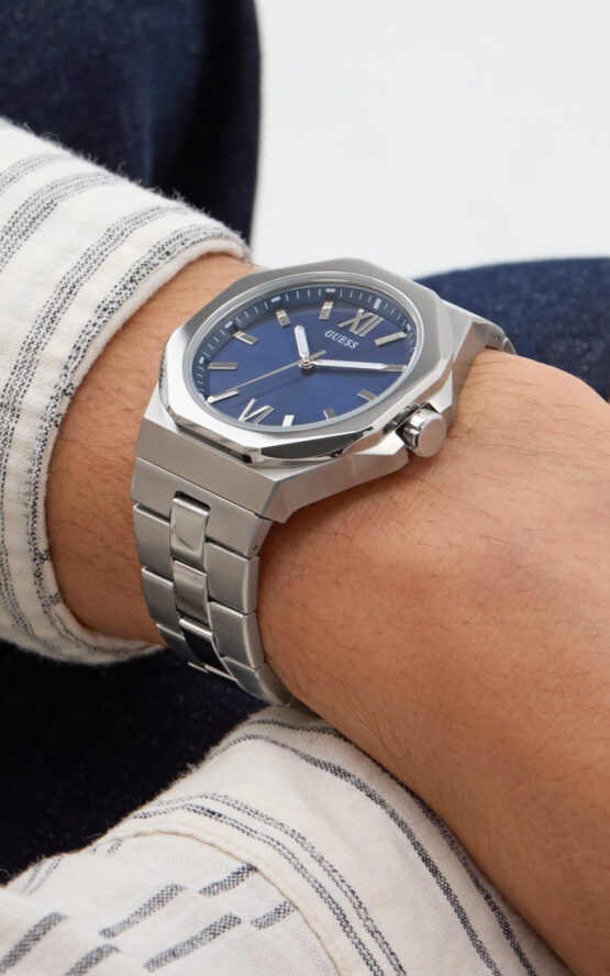 Ανδρικό ρολόι GUESS EMPEROR GW0849G1 διαμέτρου 41,5mm, με μηχανισμό Quartz ακριβείας, μπλε καντράν, κάσα και μπρασελέ από ανακυκλωμένο ατσάλι.