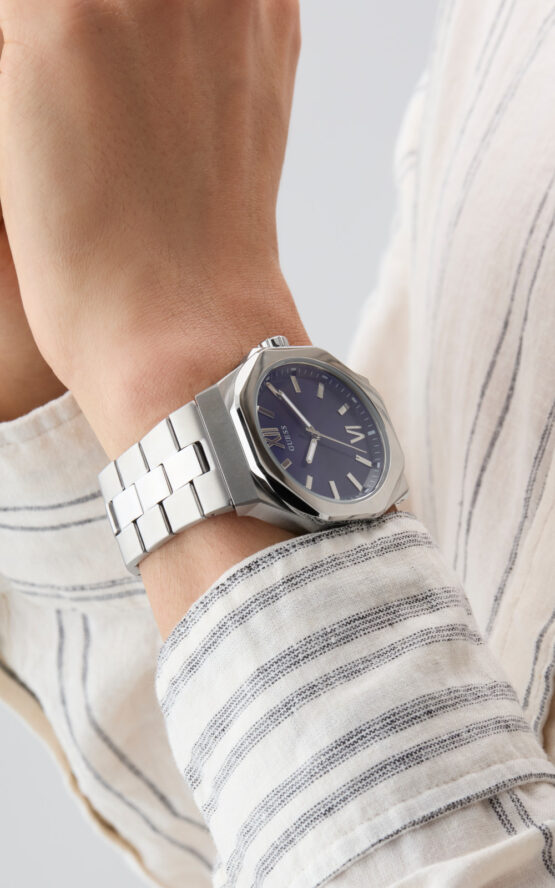 Ανδρικό ρολόι διαμέτρου 41,5mm με μηχανισμό QUARTZ ακριβείας. Έχει μπλε καντράν με ασημί δείκτες και λεπτομέρειες. Η κάσα του είναι ασημένια από ανακυκλωμένο ατσάλι, με κρύσταλλο από ορυκτό κρύσταλλο ειδικής σκλήρυνσης. Έχει ασημένιο μπρασελέ από ανακυκλωμένο ατσάλι και κούμπωμα ασφαλείας. Είναι αδιάβροχο (5 ΑΤΜ).