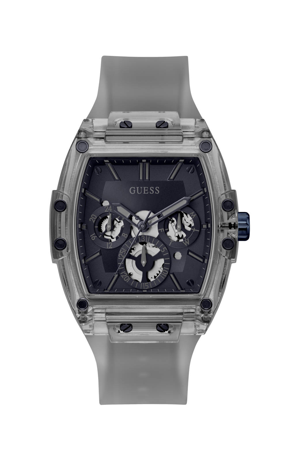 Ανδρικό ρολόι GUESS PHOENIX GW0203G9 διαμέτρου 43mm, με μηχανισμό Quartz Multifunction ακριβείας, μπλε καντράν, γκρι κάσα και καουτσούκ λουράκι.