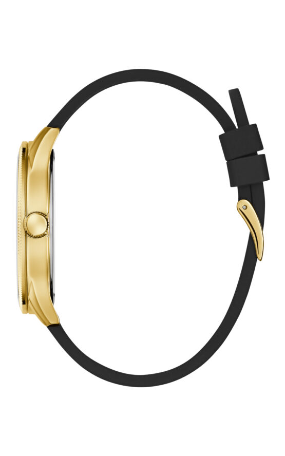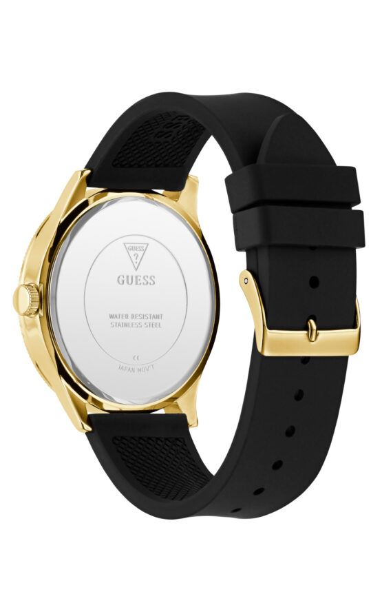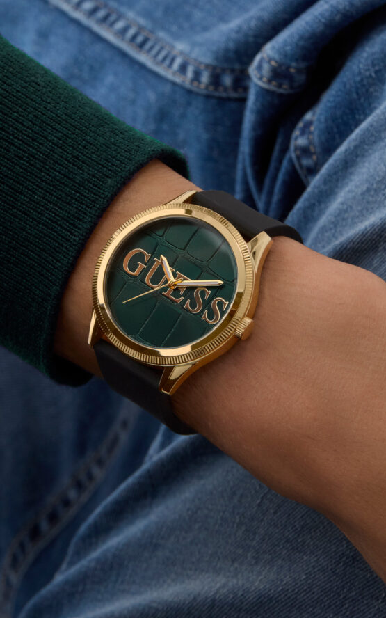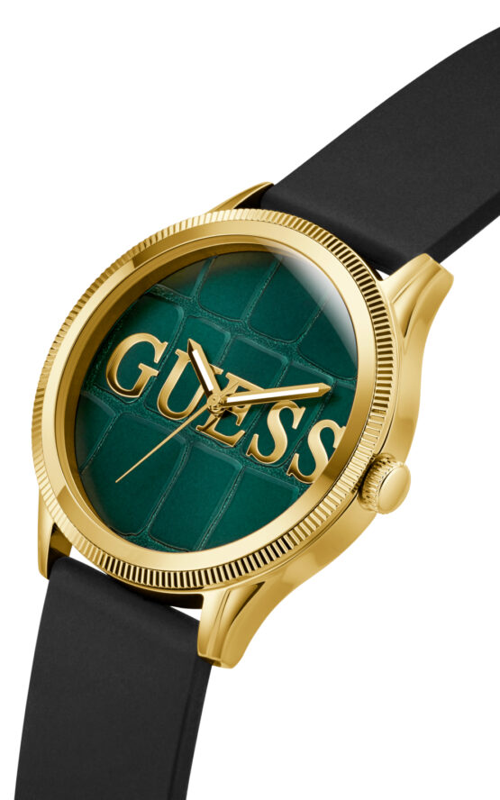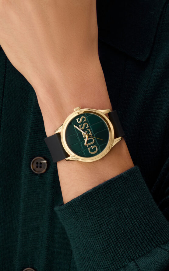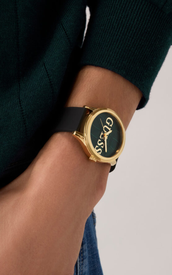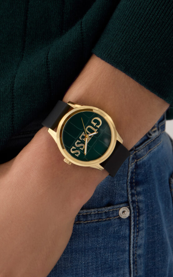 Ανδρικό ρολόι GUESS REPUTATION GW0887G2 διαμέτρου 44mm, μηχανισμό QUARTZ ακριβείας, πράσινο καντράν, χρυσή κάσα από ανακυκλωμένο ατσάλι και μαύρο λουράκι από καουτσούκ .