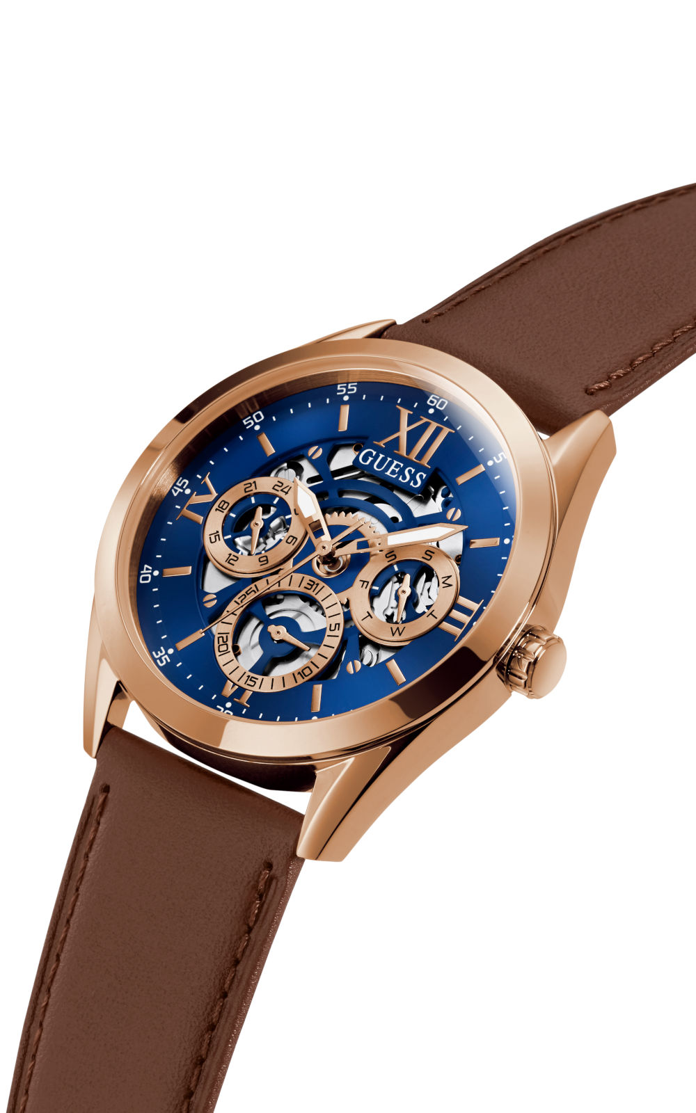 Ανδρικό ρολόι διαμέτρου 42mm με μηχανισμό QUARTZ Multi-Function Ακριβείας. Έχει μπλε με χρυσό καντράν με εμφανή μηχανισμό, ροζ χρυσούς δείκτες και λεπτομέρειες. Η κάσα του είναι ροζ χρυσού χρώματος από ανοξείδωτο ατσάλι με κρύσταλλο από ορυκτό κρύσταλλο ειδικής σκλήρυνσης. Έχει δερμάτινο λουράκι καφέ χρώματος με κούμπωμα τοκάς. Δεν είναι αδιάβροχο.