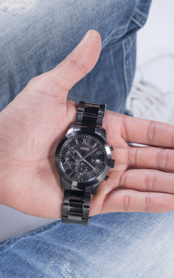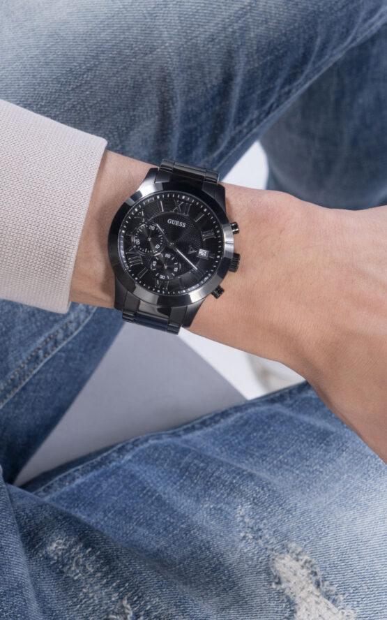 Ανδρικό ρολόι GUESS ATLAS W0668G5 διαμέτρου 45mm, με μηχανισμό Quartz χρονογράφου ακριβείας, μαύρο καντράν, μαύρη κάσα και μπρασελέ από ανοξείδωτο ατσάλι.