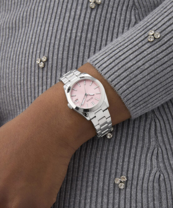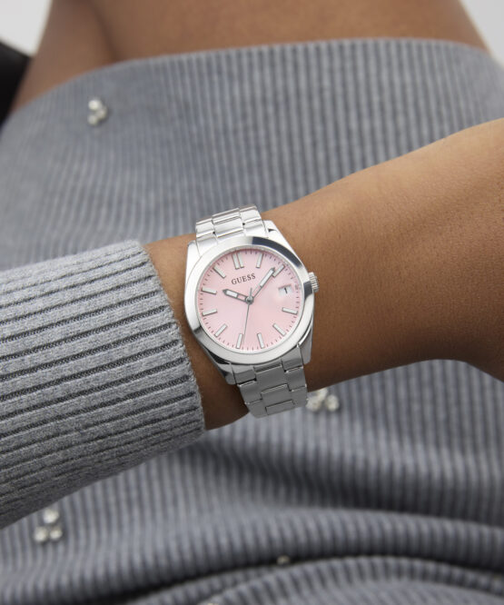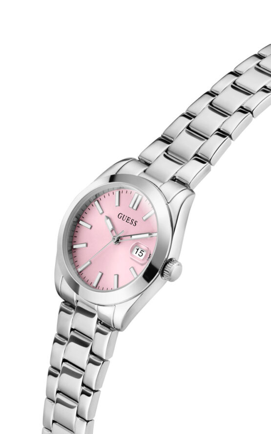 Γυναικείο ρολόι GUESS ALICE GW0934L1 διαμέτρου 32mm, με μηχανισμό QUARTZ ακριβείας, ροζ καντράν, κάσα και μπρασελέ από ανακυκλωμένο ατσάλι.