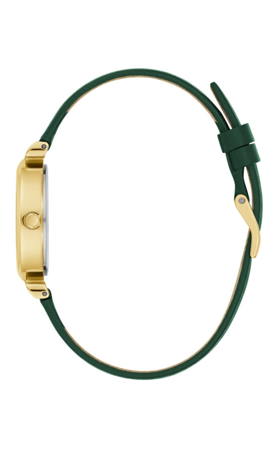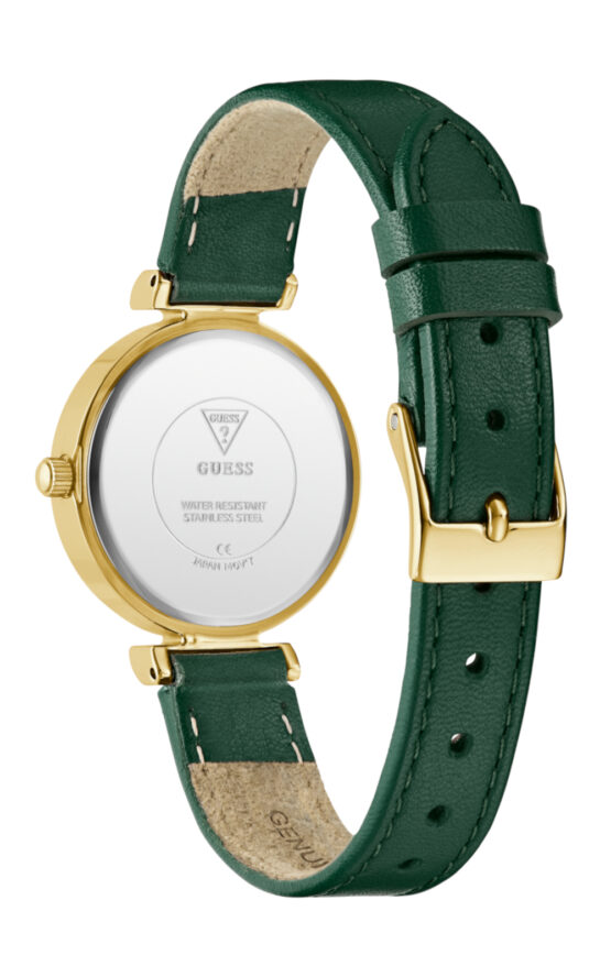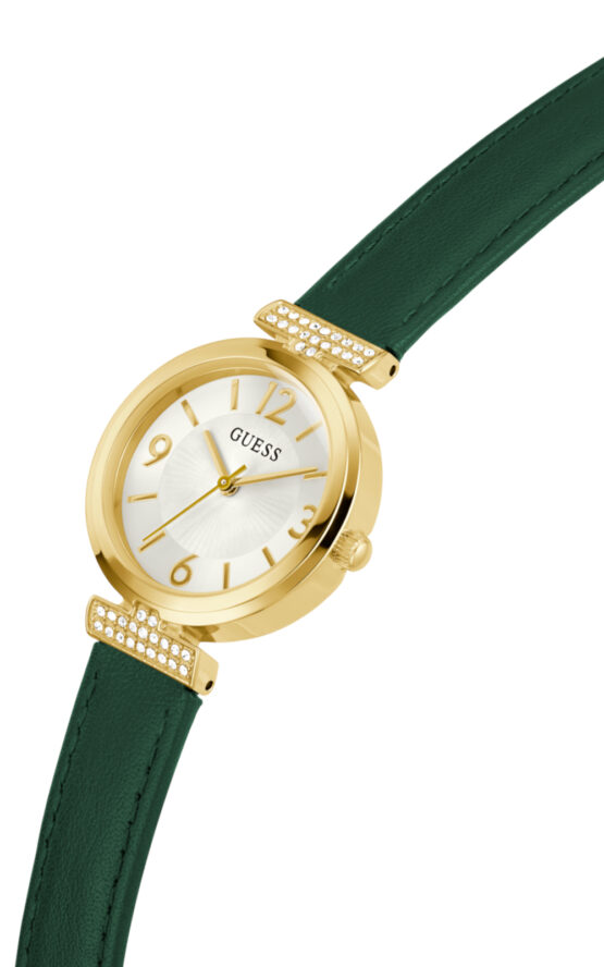 Γυναικείο ρολόι GUESS ARRAY GW0614L4 διαμέτρου 28mm, με μηχανισμό QUARTZ ακριβείας, λευκό καντράν και πράσινο δερμάτινο λουράκι.