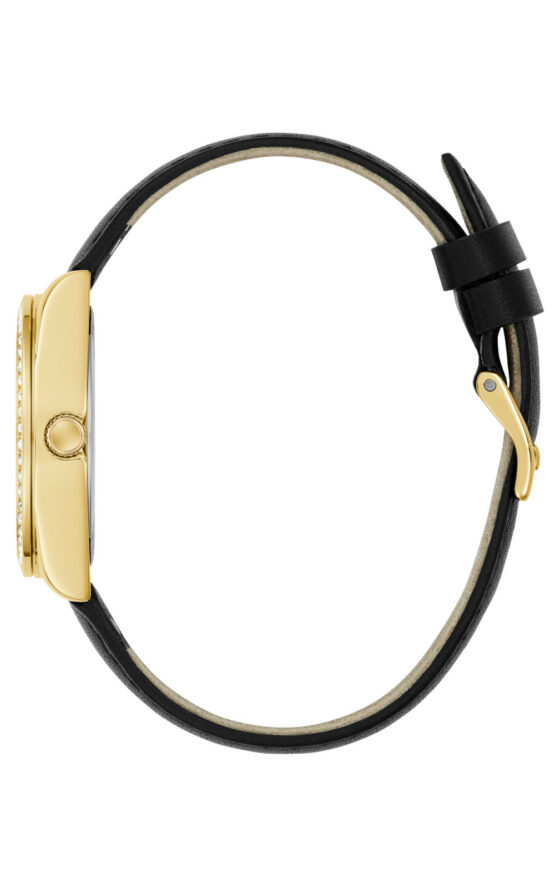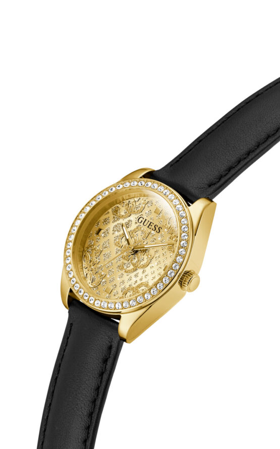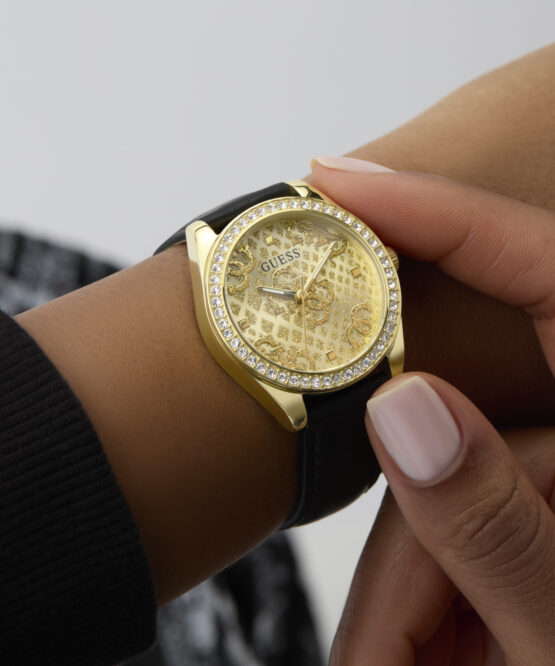 Γυναικείο ρολόι διαμέτρου 32mm με μηχανισμό QUARTZ ακριβείας. Έχει χρυσό καντράν με χρυσούς δείκτες και λεπτομέρειες και είναι διακοσμημένο με πέτρες. Η κάσα του είναι από ανακυκλωμένο ατσάλι με κρύσταλλο από ορυκτό κρύσταλλο ειδικής σκλήρυνσης. Έχει μαύρο λουράκι από δέρμα και κούμπωμα τοκάς. Δεν είναι αδιάβροχο.