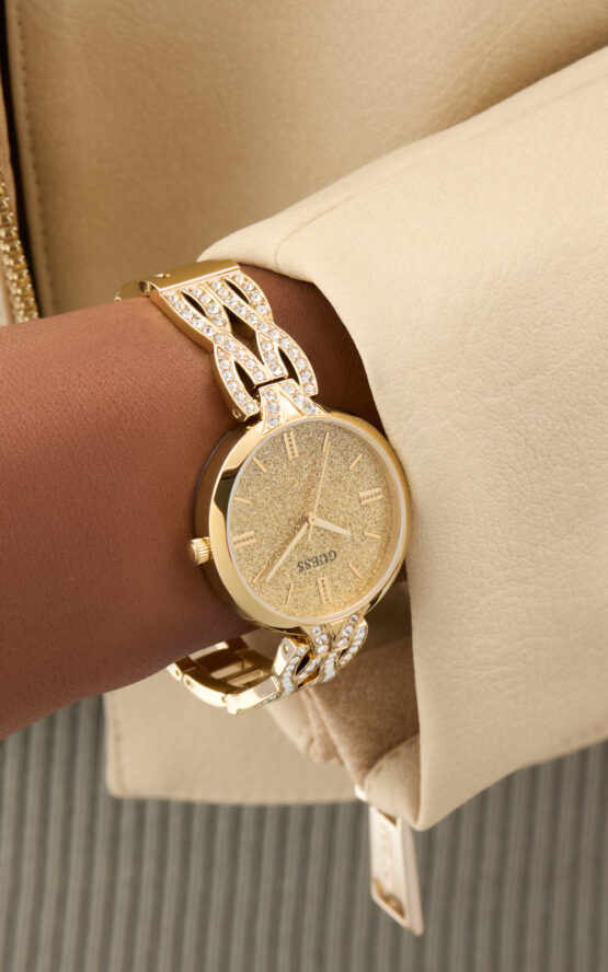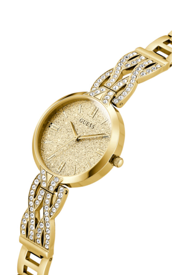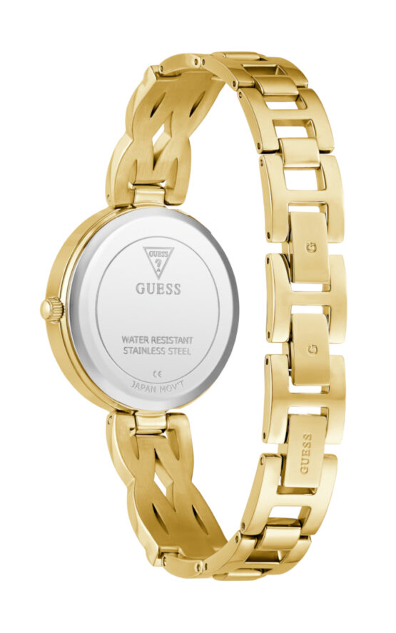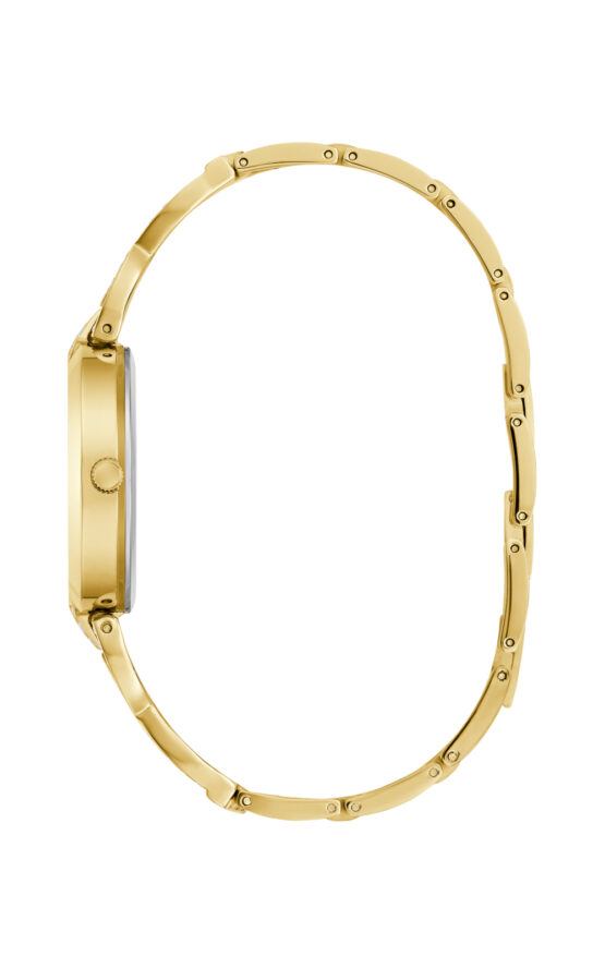 Γυναικείο ρολόι GUESS CORAL GW0868L2 διαμέτρου 32mm, με μηχανισμό QUARTZ ακριβείας, χρυσό καντράν, κάσα και μπρασελέ από ανακυκλωμένο ατσάλι.