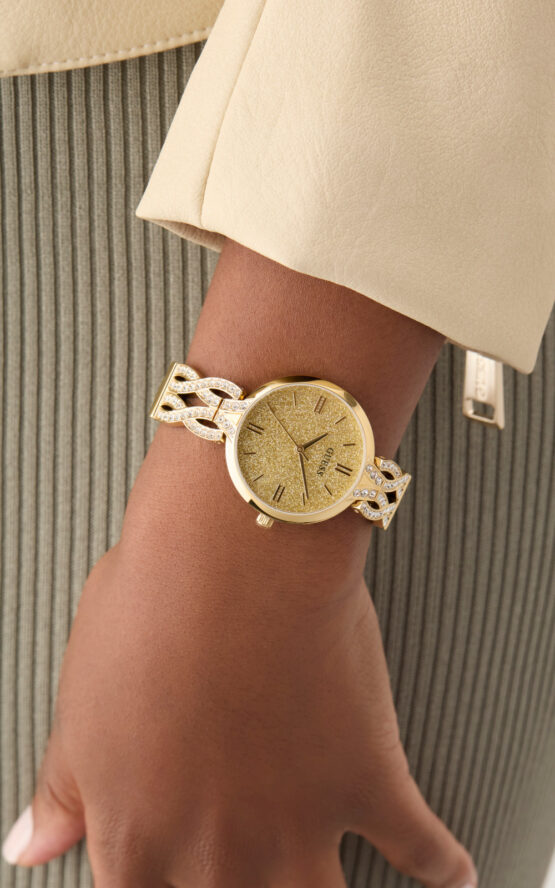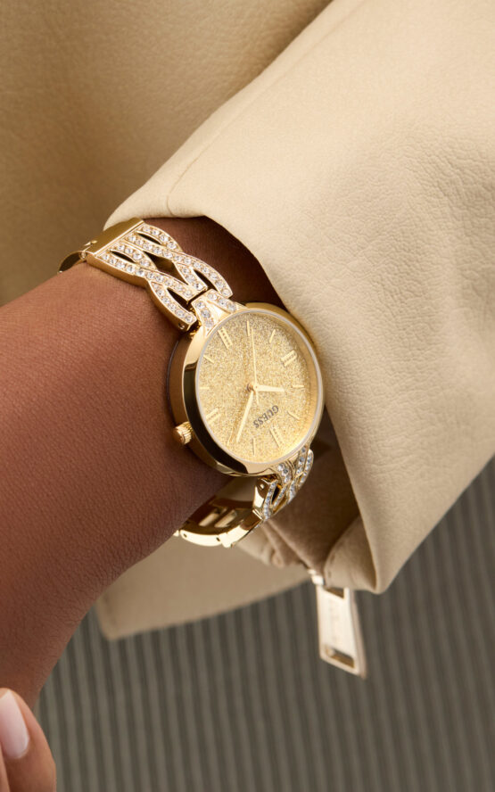 Γυναικείο ρολόι διαμέτρου 32mm με μηχανισμό QUARTZ ακριβείας. Έχει χρυσό καντράν με χρυσούς δείκτες και λεπτομέρειες. Η κάσα του είναι από ανακυκλωμένο ατσάλι με κρύσταλλο από ορυκτό κρύσταλλο ειδικής σκλήρυνσης. Έχει μπρασελέ από ανακυκλωμένο ατσάλι και κούμπωμα G-Link. Δεν είναι αδιάβροχο.