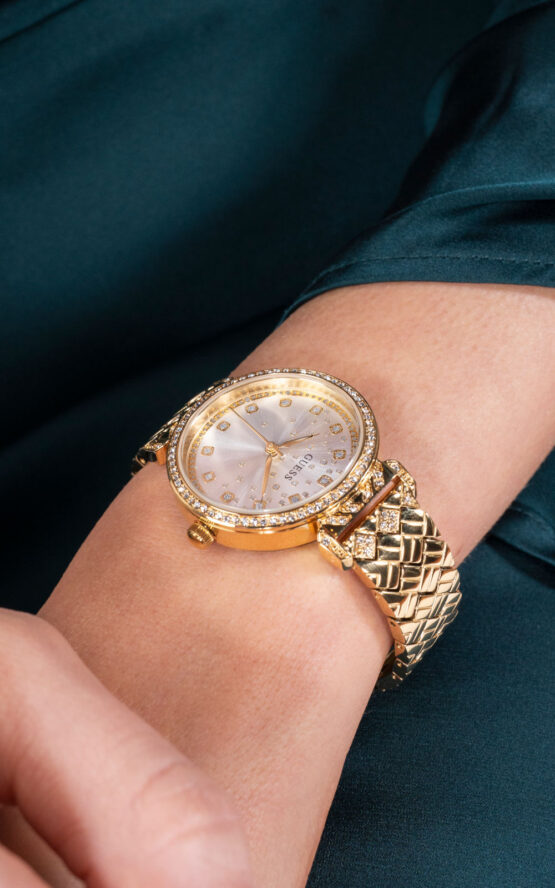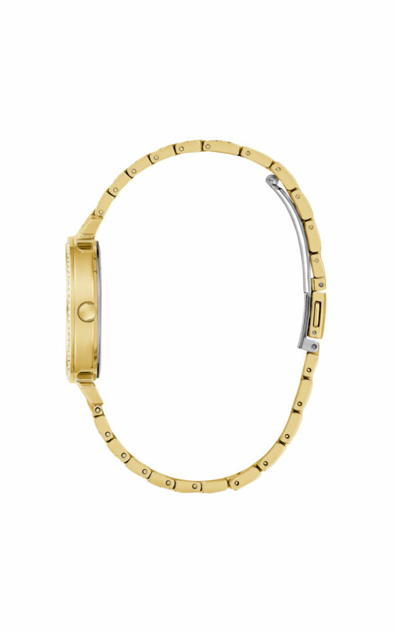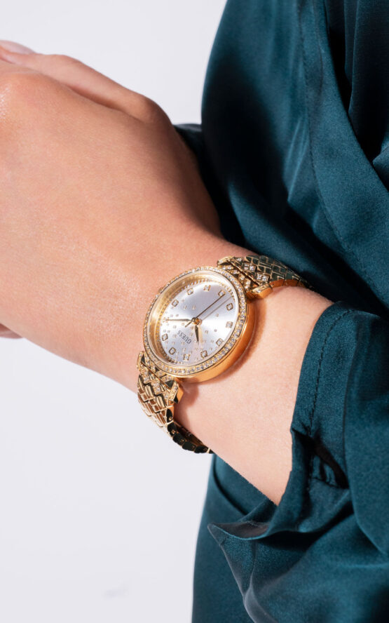 Γυναικείο ρολόι διαμέτρου 32mm με μηχανισμό QUARTZ ακριβείας. Έχει χρυσό καντράν με διαφανείς πέτρες ζιργκόν και επίχρυσους δείκτες. Η κάσα του είναι από ανακυκλωμένο ατσάλι με χρυσές λεπτομέρειες.Έχει χρυσό μπρασελέ και κούμπωμα ασφαλείας. Δεν είναι αδιάβροχο.