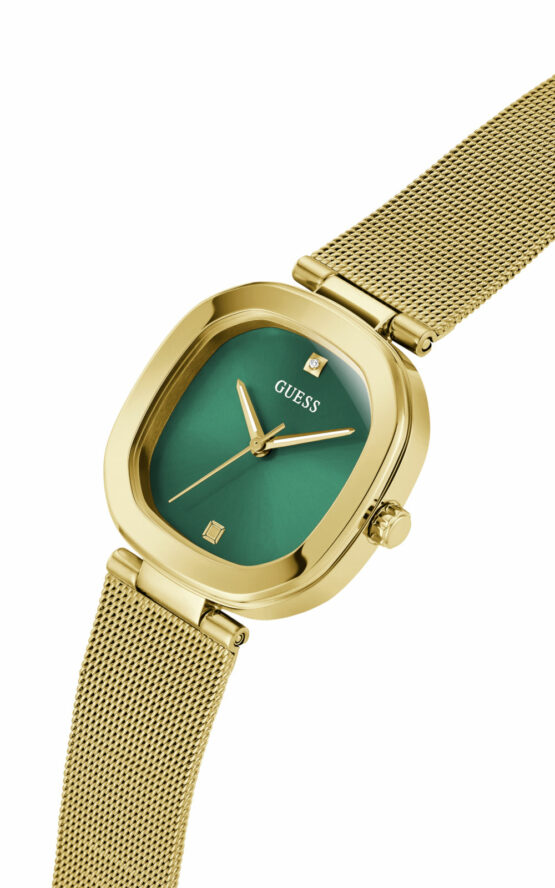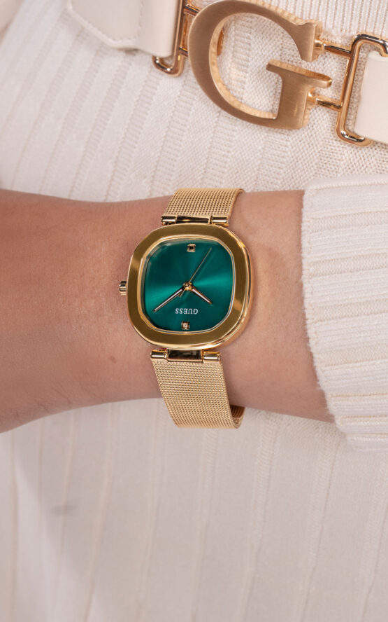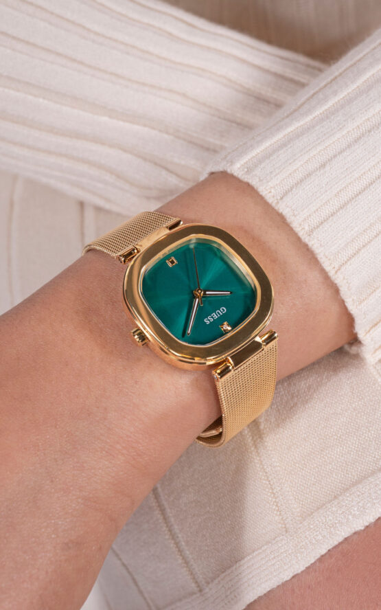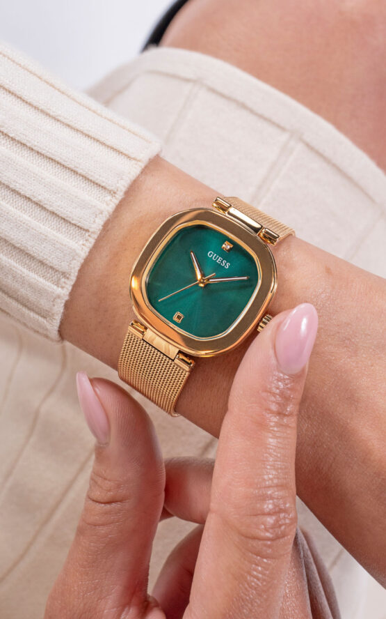 Γυναικείο ρολόι διαμέτρου 32mm με μηχανισμό QUARTZ ακριβείας. Έχει πράσινο καντράν με διάφανη πέτρα ζιργκόν και χρυσούς δείκτες. Η κάσα του είναι από ανακυκλωμένο ατσάλι με χρυσές λεπτομέρειες.Έχει χρυσό μπρασελέ και κούμπωμα κλιπ. Δεν είναι αδιάβροχο.