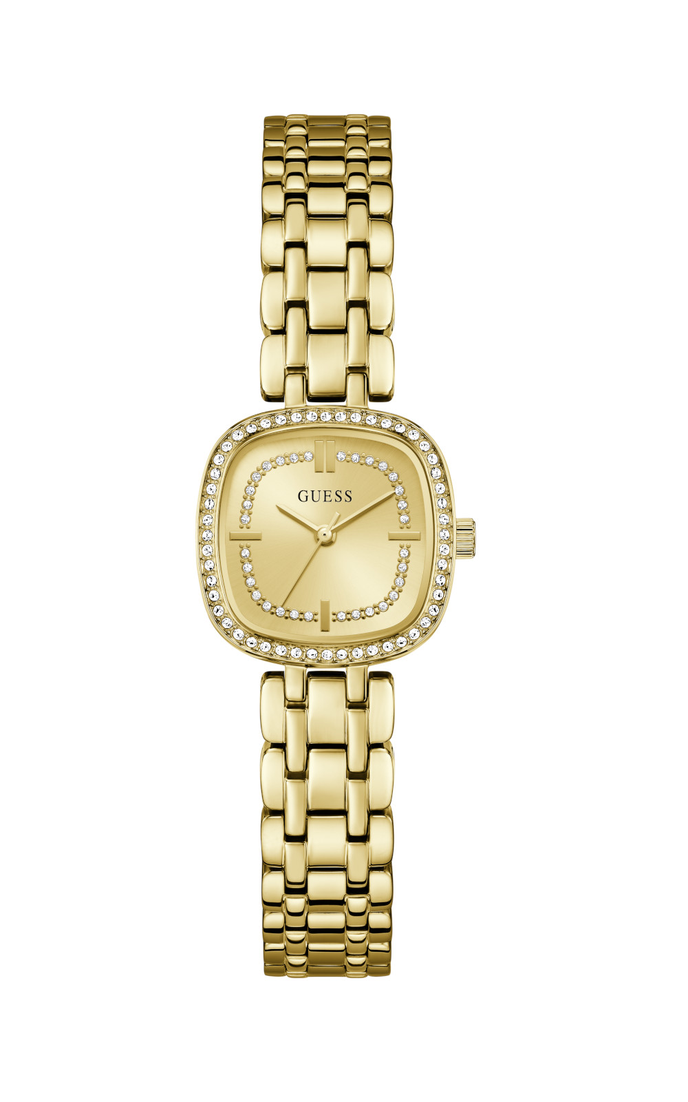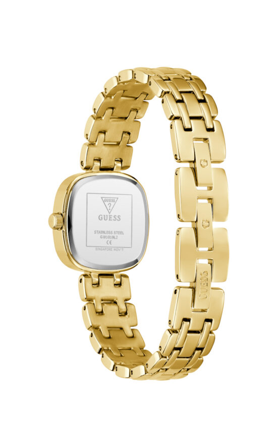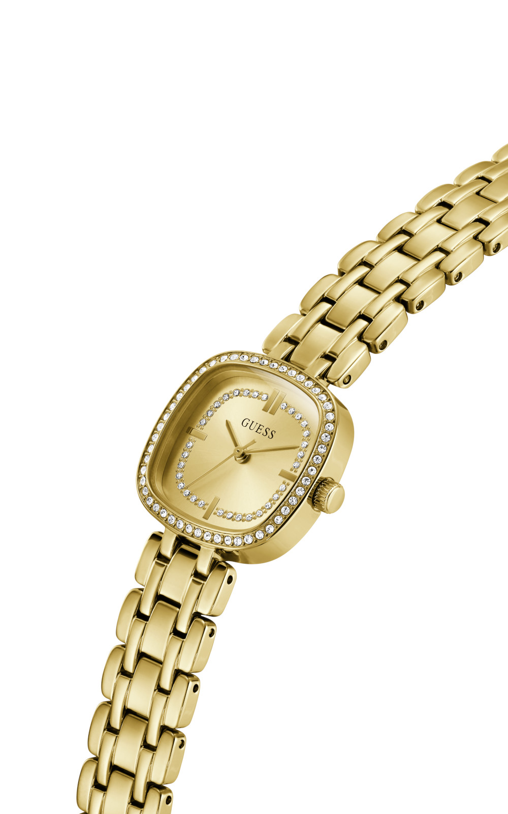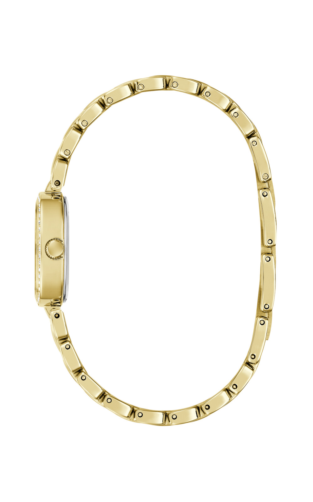 Γυναικείο ρολόι διαμέτρου 25mm με μηχανισμό QUARTZ ακριβείας. Έχει χρυσό καντράν με χρυσούς δείκτες και λεπτομέρειες και είναι διακοσμημένο με πέτρες. Η κάσα του είναι χρυσή από ανακυκλωμένο ατσάλι και έχει κρύσταλλο από ορυκτό κρύσταλλο ειδικής σκλήρυνσης. Έχει μπρασελέ από ανακυκλωμένο ατσάλι με κούμπωμα G-LINK. Είναι αδιάβροχο(5ΑΤΜ).