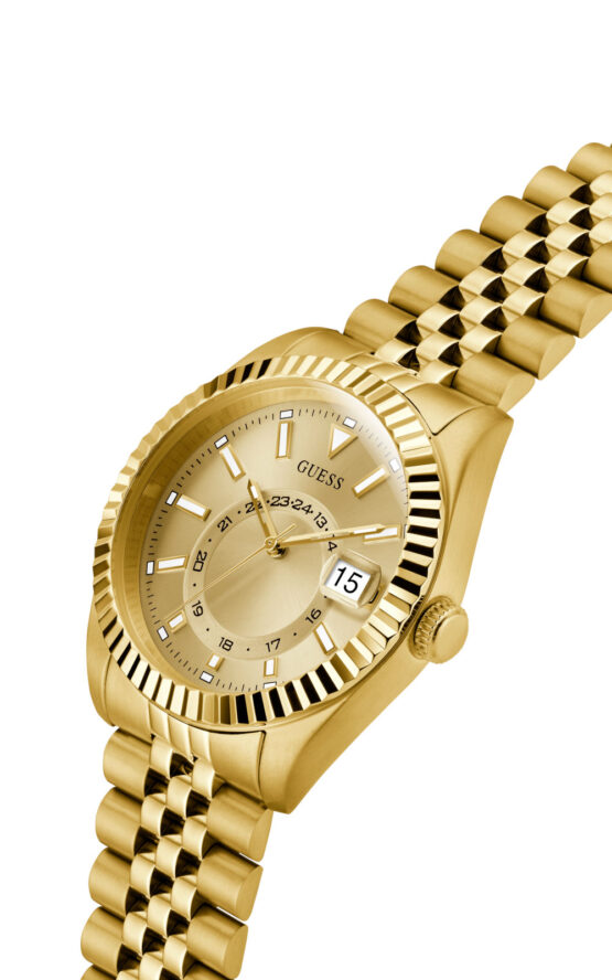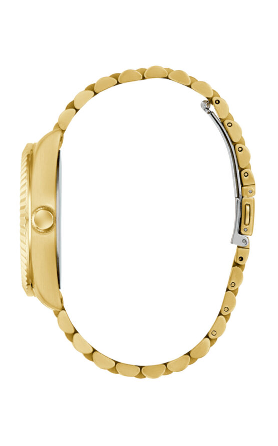 Γυναικείο ρολόι διαμέτρου 42mm με μηχανισμό QUARTZ Multifuction ακριβείας. Έχει χρυσό καντράν με χρυσούς δείκτες και λεπτομέρειες. Η κάσα του είναι από ανακυκλωμένο ατσάλι, με κρύσταλλο από ορυκτό κρύσταλλο ειδικής σκλήρυνσης. Έχει χρυσό μπρασελέ από ανακυκλωμένο ατσάλι και κούμπωμα ασφαλείας. Είναι αδιάβροχο (5ΑΤΜ)