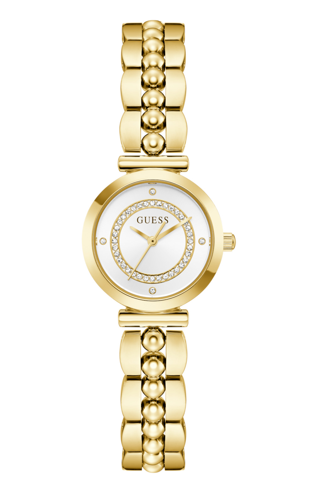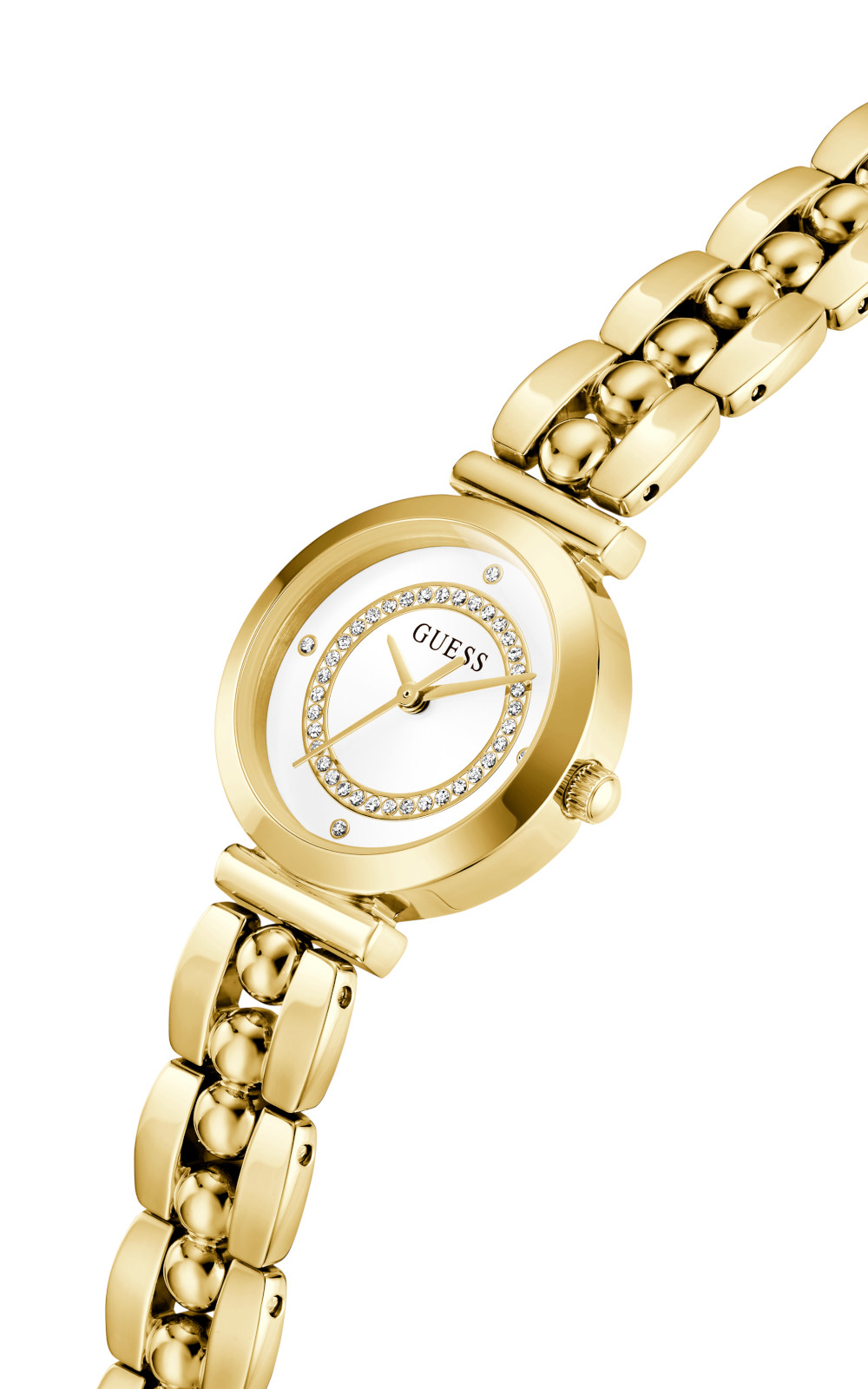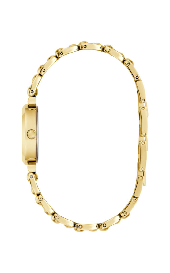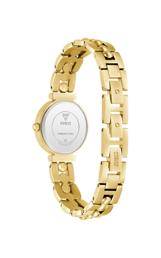 Γυναικείο ρολόι GUESS LEENA GW0994L2 διαμέτρου 26mm, με μηχανισμό QUARTZ ακριβείας,χρυσό καντράν, κάσα και μπρασελέ από ανακυκλωμένο ατσάλι.