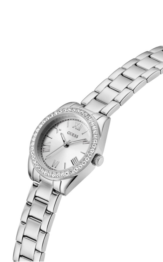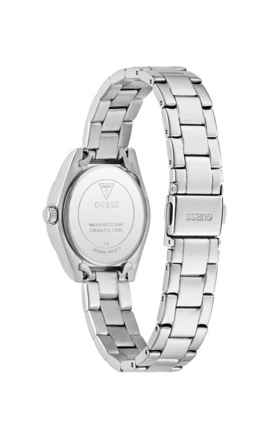 Γυναικείο ρολόι GUESS MINI LUNA GW0841L6 διαμέτρου 30mm, με μηχανισμό QUARTZ ακριβείας, ασημί καντράν, κάσα και μπρασελέ από ανακυκλωμένο ατσάλι.