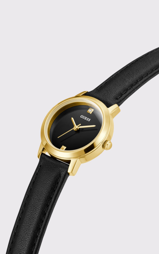 Γυναικείο ρολόι GUESS MINI NOVA GW0246L3 διαμέτρου 25mm, με μηχανισμό QUARTZ ακριβείας, μαύρο καντράν, κάσα από ανοξείδωτο ατσάλι και μαύρο δερμάτινο λουράκι.