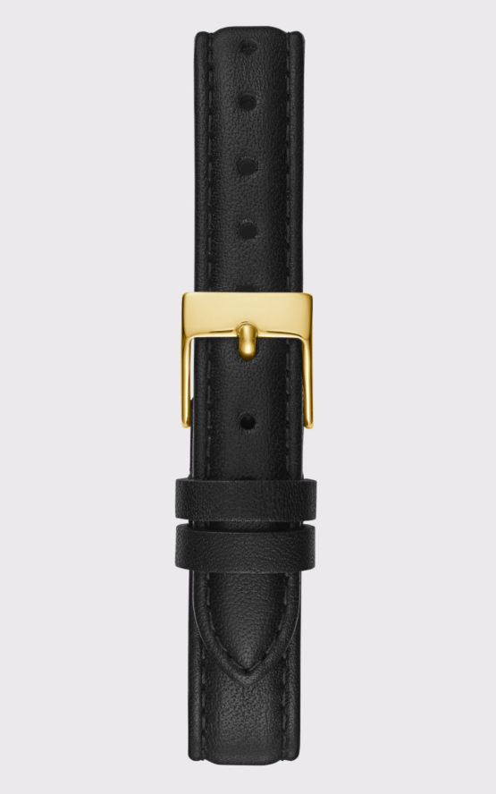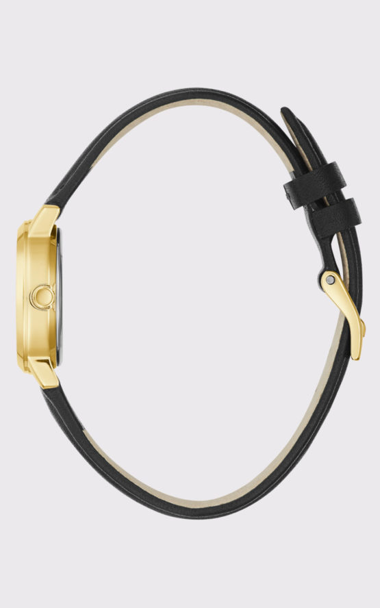 Γυναικείο ρολόι διαμέτρου 25mm με μηχανισμό QUARTZ ακριβείας. Έχει μαύρο καντράν, χρυσούς δείκτες και λεπτομέρειες. Η κάσα του είναι επίχρυση από ανοξείδωτο ατσάλι με κρύσταλλο από ορυκτό κρύσταλλο ειδικής σκλήρυνσης. Έχει δερμάτινο λουράκι μαύρου χρώματος και κούμπωμα τοκάς. Δεν είναι αδιάβροχο.