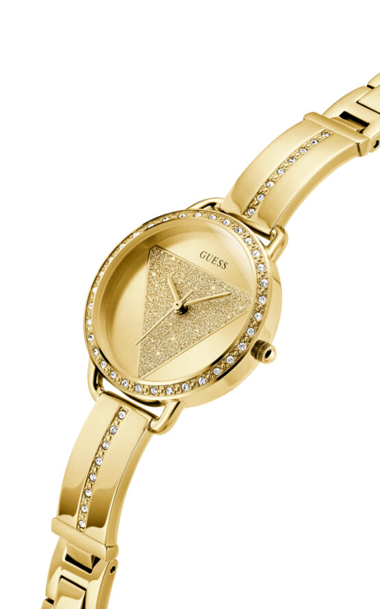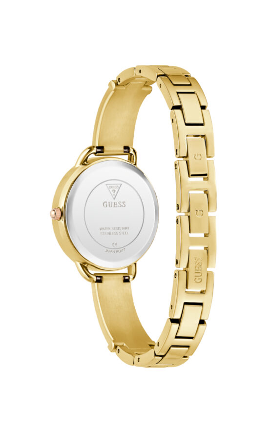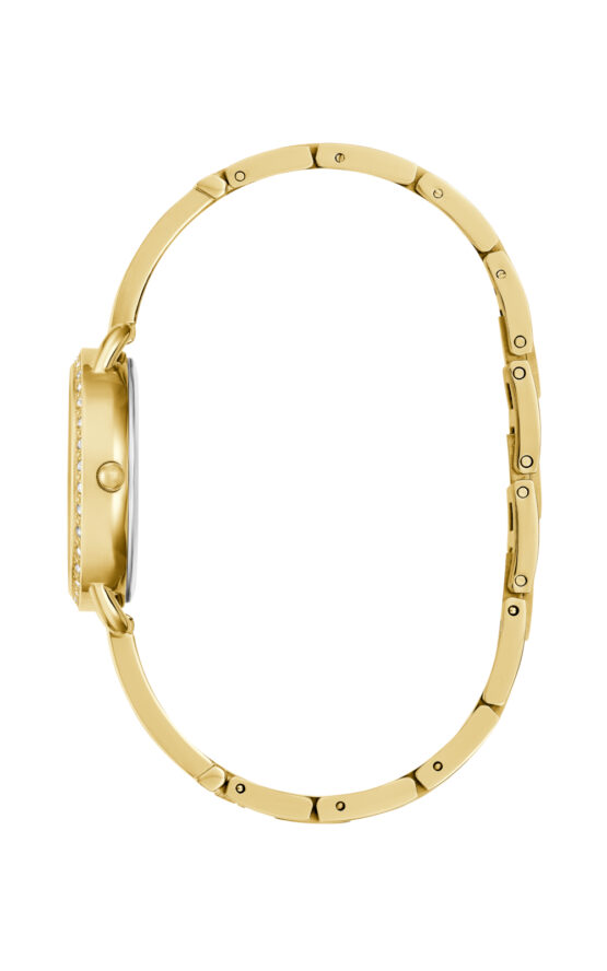 Γυναικείο ρολόι διαμέτρου 30mm με μηχανισμό QUARTZ ακριβείας. Έχει χρυσό καντράν με χρυσούς δείκτες και λεπτομέρειες. Η κάσα του είναι από ανακυκλωμένο ατσάλι με κρύσταλλο από ορυκτό κρύσταλλο ειδικής σκλήρυνσης. Έχει μπρασελέ από ανακυκλωμένο ατσάλι και κούμπωμα G-Link. Δεν είναι αδιάβροχο.